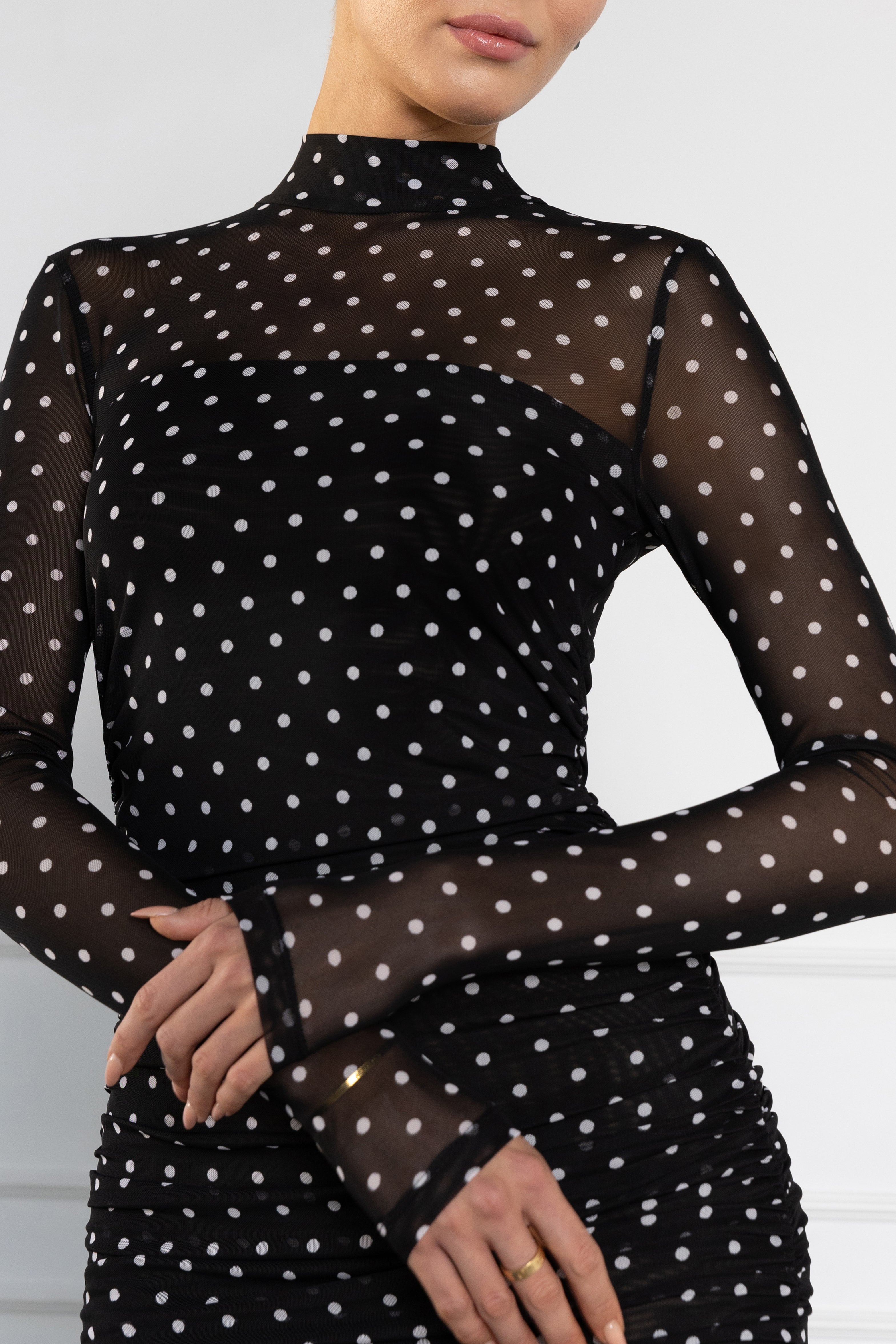A sheer, statement-making gown designed for bold nights and memorable entrances. Crafted in polka-dot mesh, the Scarlett Gown features a sleek mock neckline, long sleeves, and a floor-length silhouette that floats with ease. Its body-hugging mini slip balances coverage and allure, while the dramatic long tie at the neck adds styling versatility—wear it draped down the back or knotted at the front for a personalized twist.