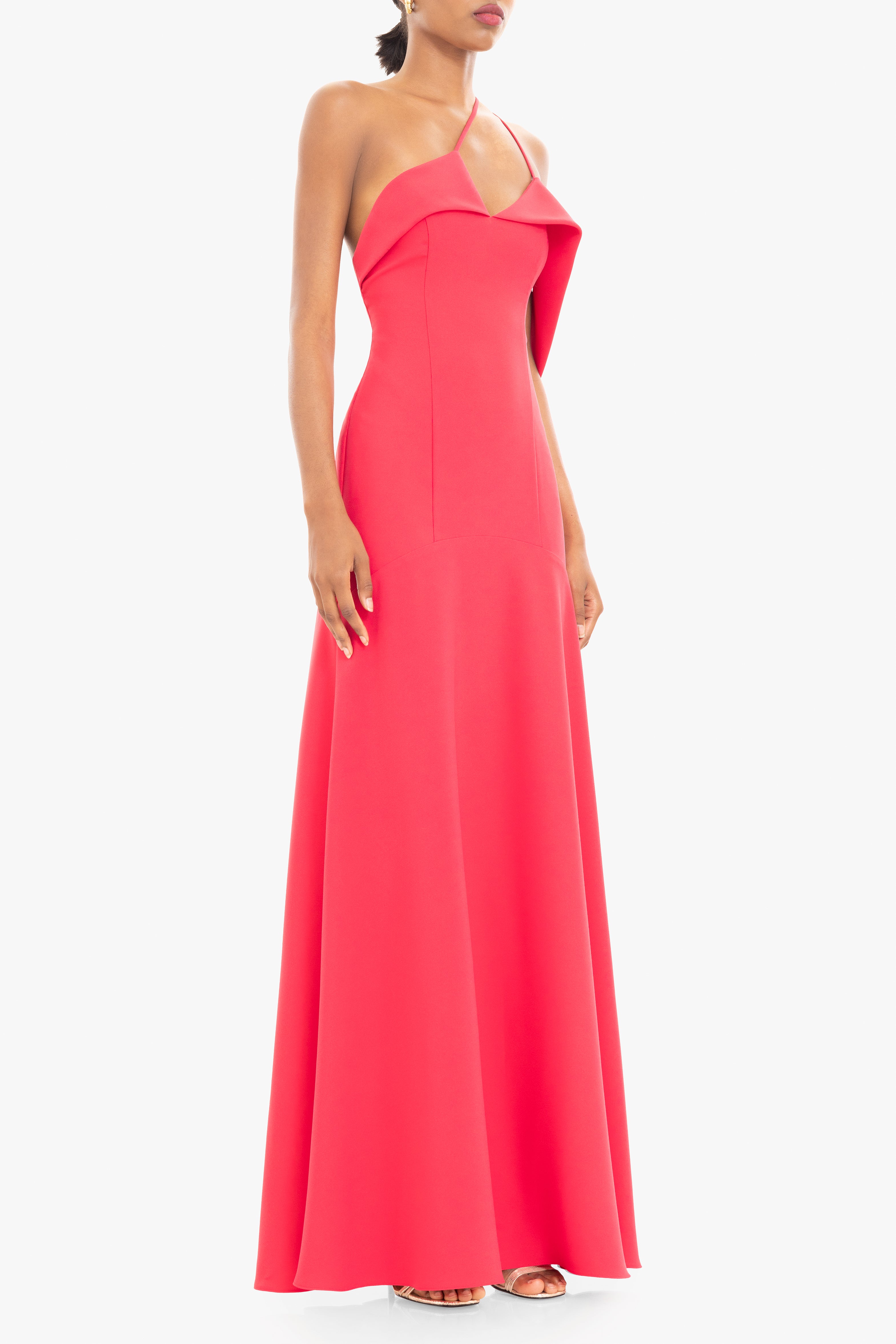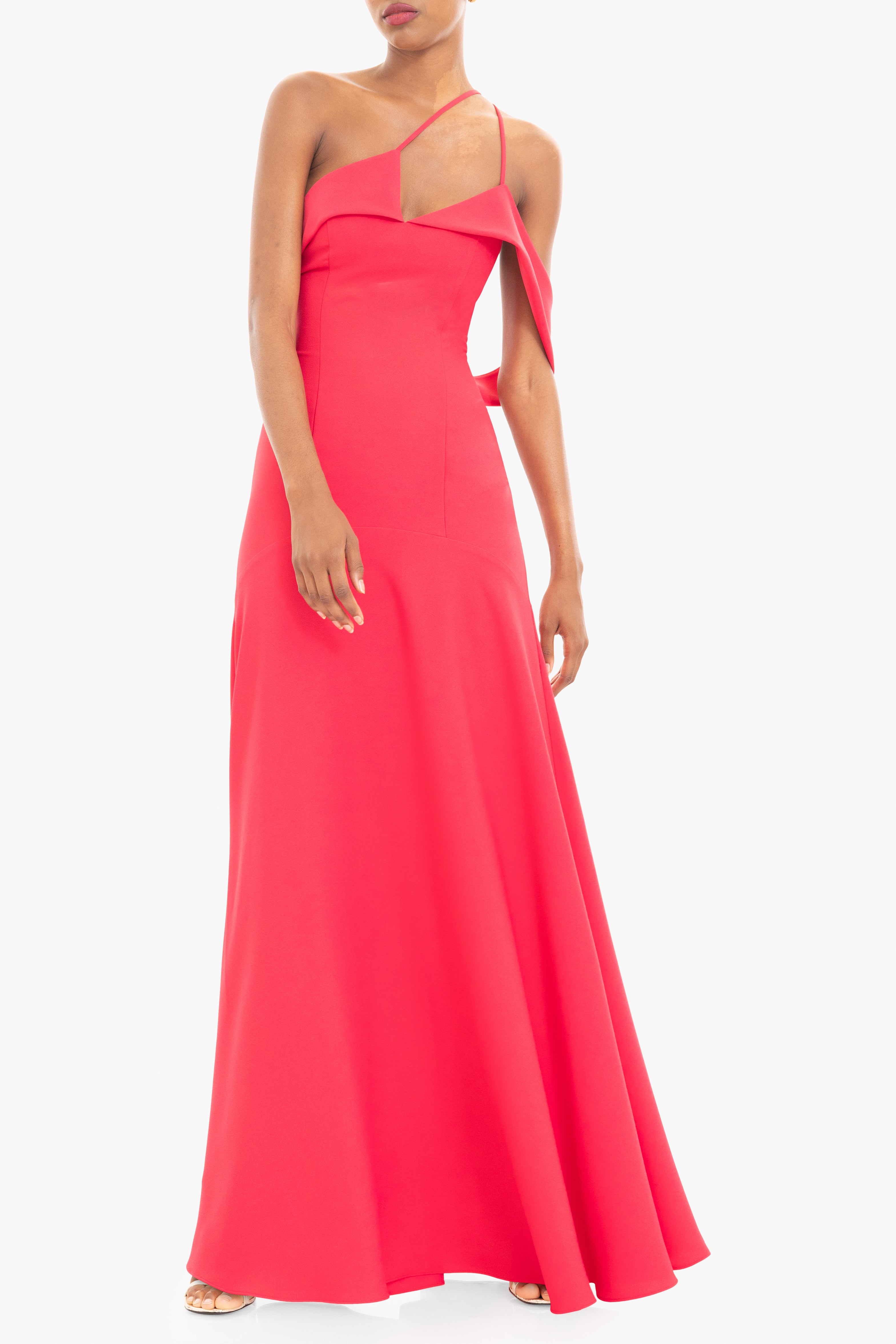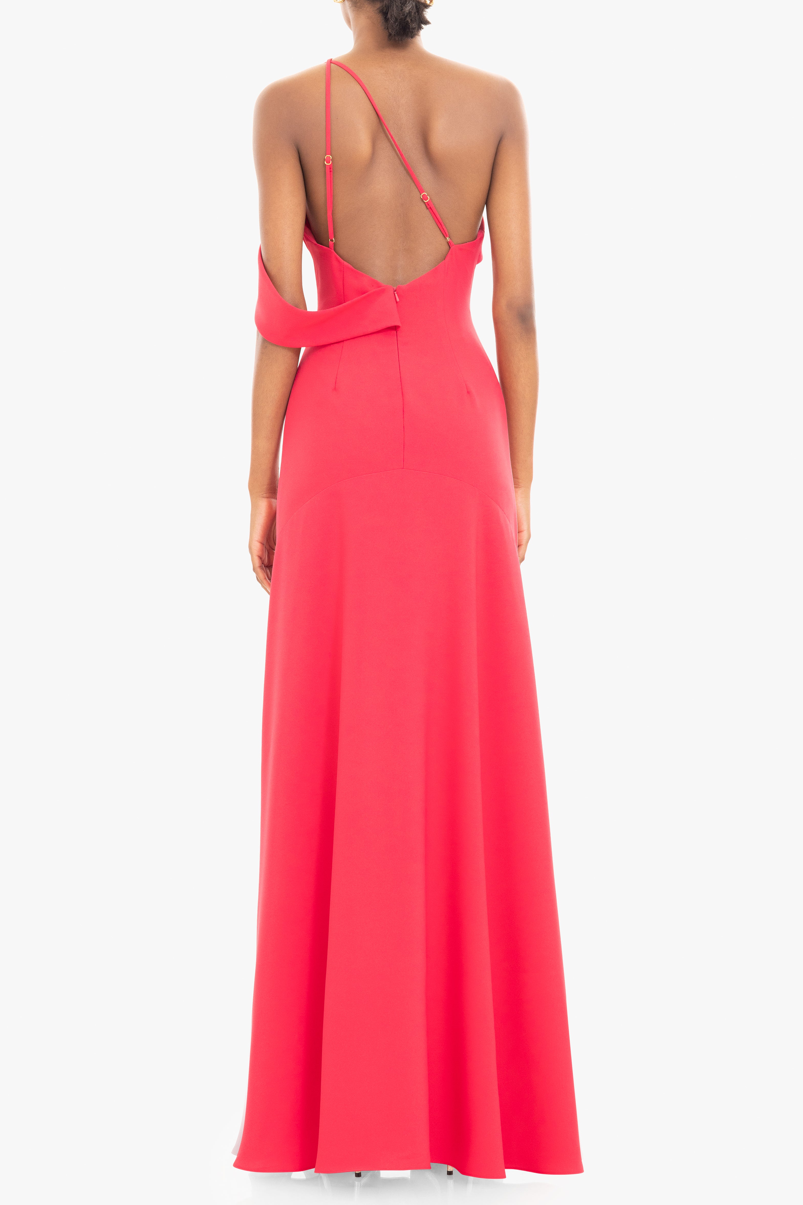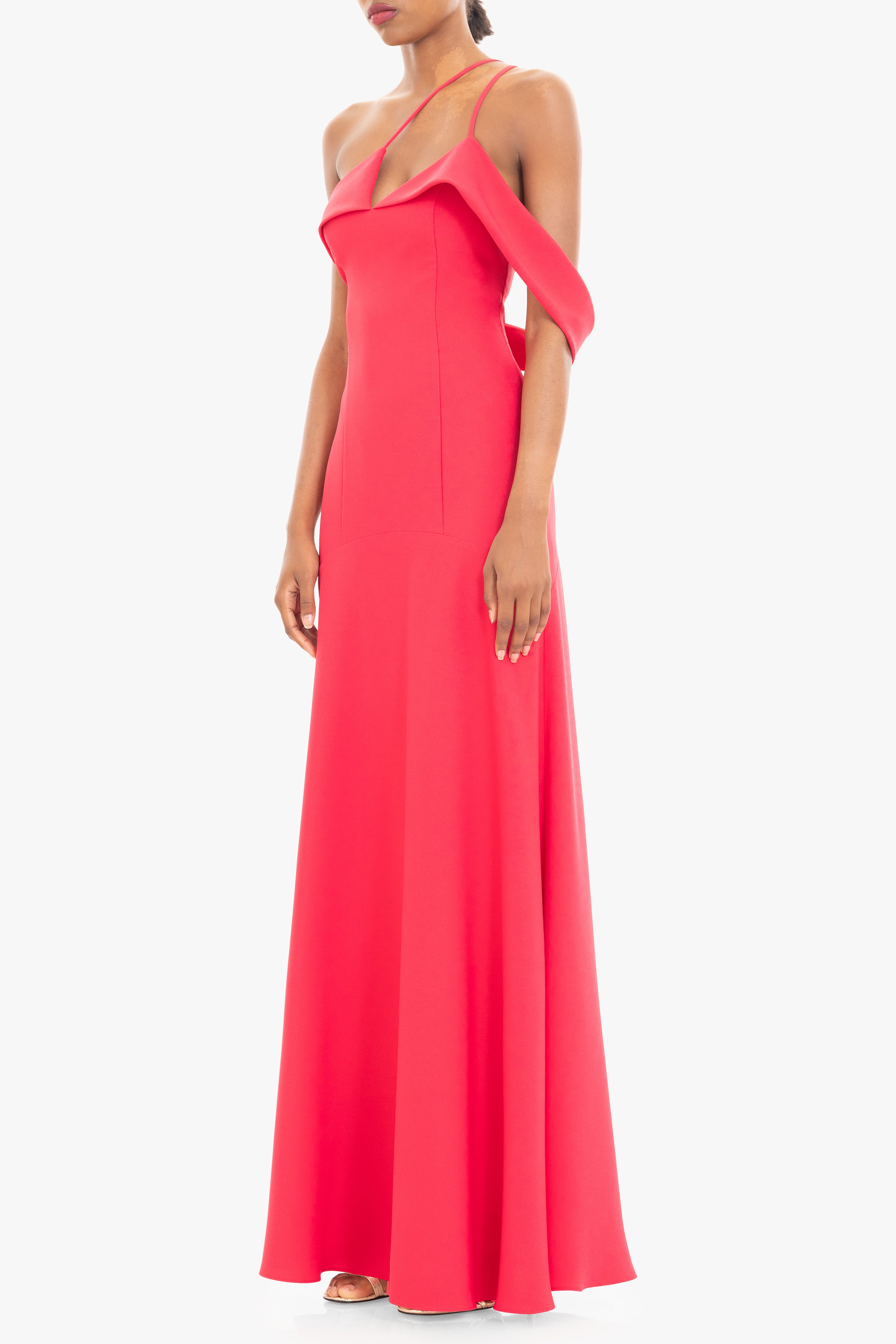 The Nairobi Gown combines sharp geometry with fluid movement. The asymmetrical neckline features a sculptural draped fold that cuts across the bodice, anchored by delicate one-shoulder spaghetti straps for a striking contrast. Princess seams contour the body, while the high fishtail hem creates an elongated silhouette that moves beautifully as you walk.
