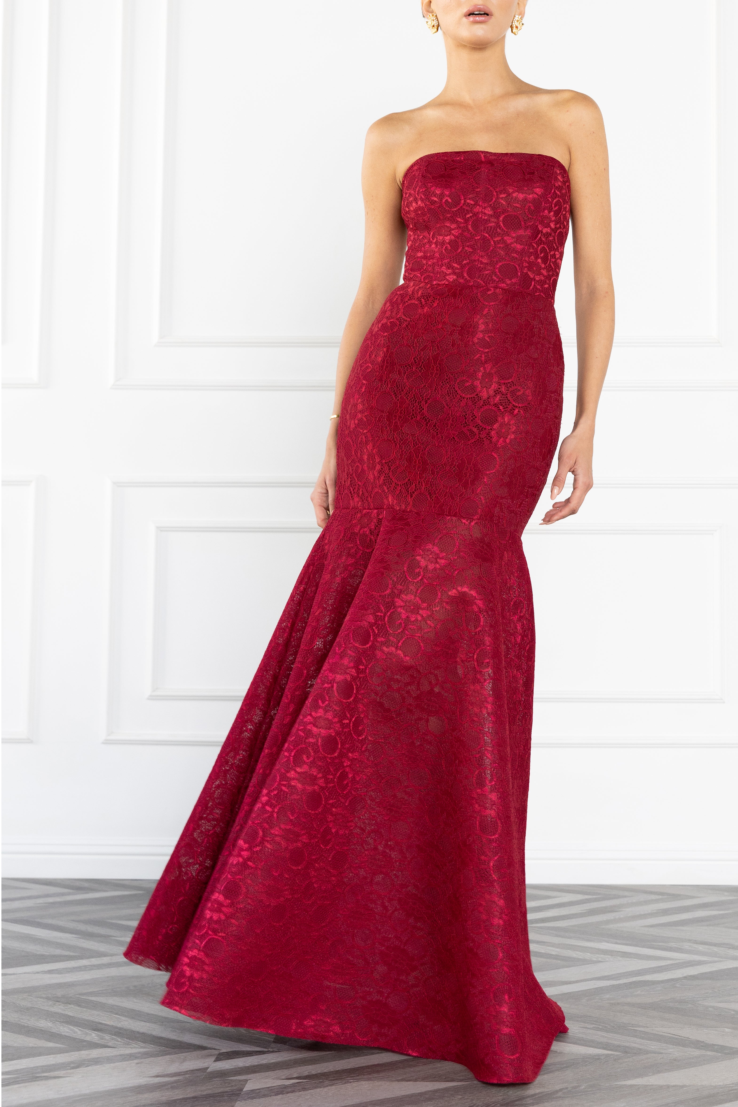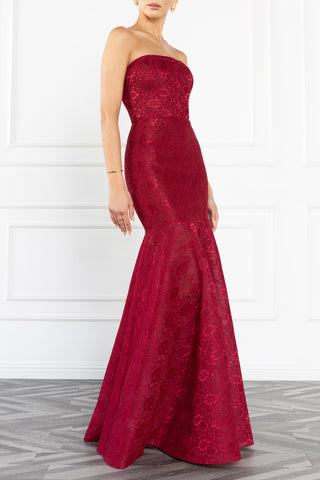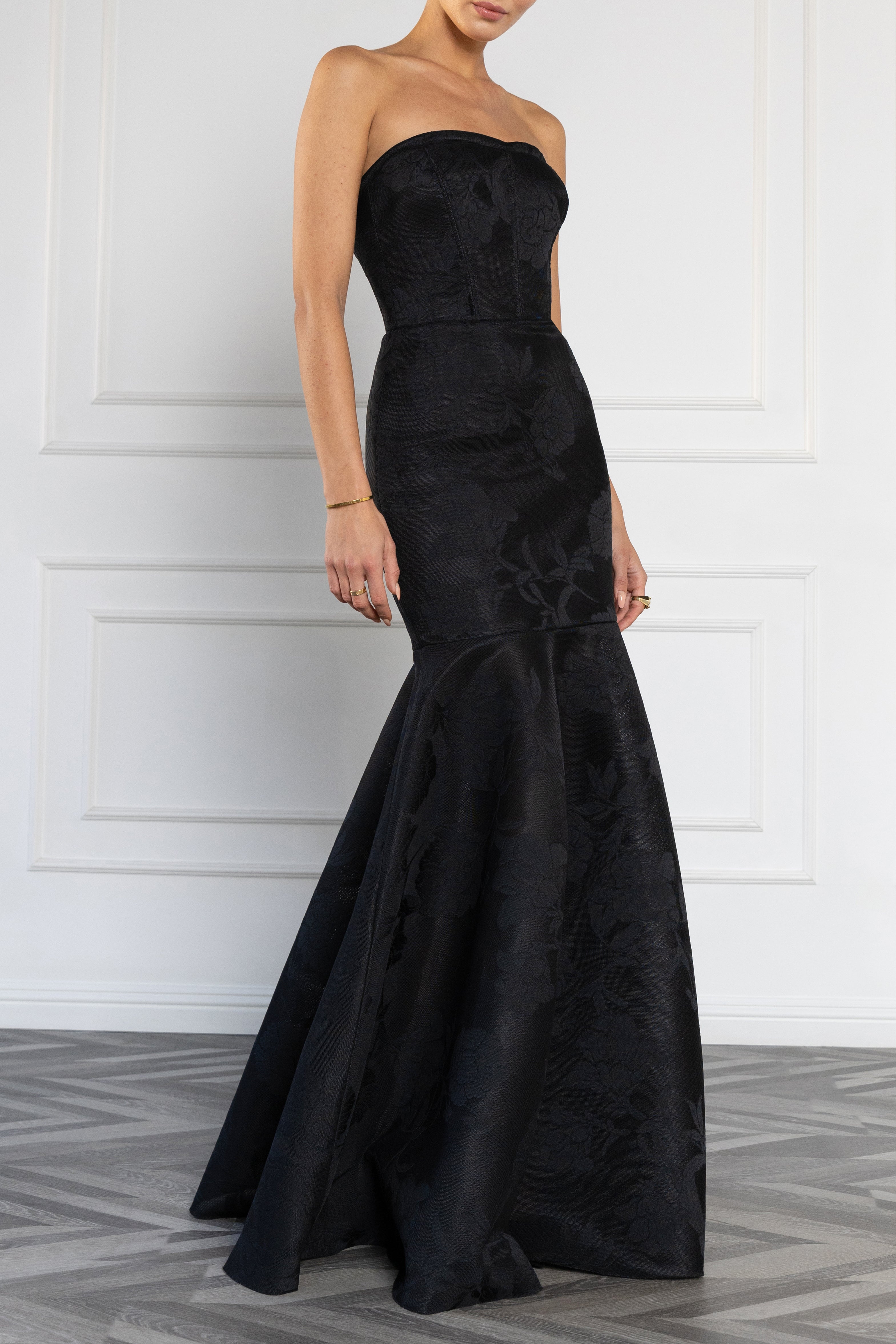 The Kristy Gown is a modern take on classic eveningwear. Crafted in a rich jacquard fabric, the strapless silhouette features subtle piping along the neckline and a boned bodice that contours the waist. The fitted shape flares into a dramatic floor-length skirt with a circle sweep, creating graceful volume and movement with every step. It’s an effortlessly striking gown, perfect for any black-tie affair.