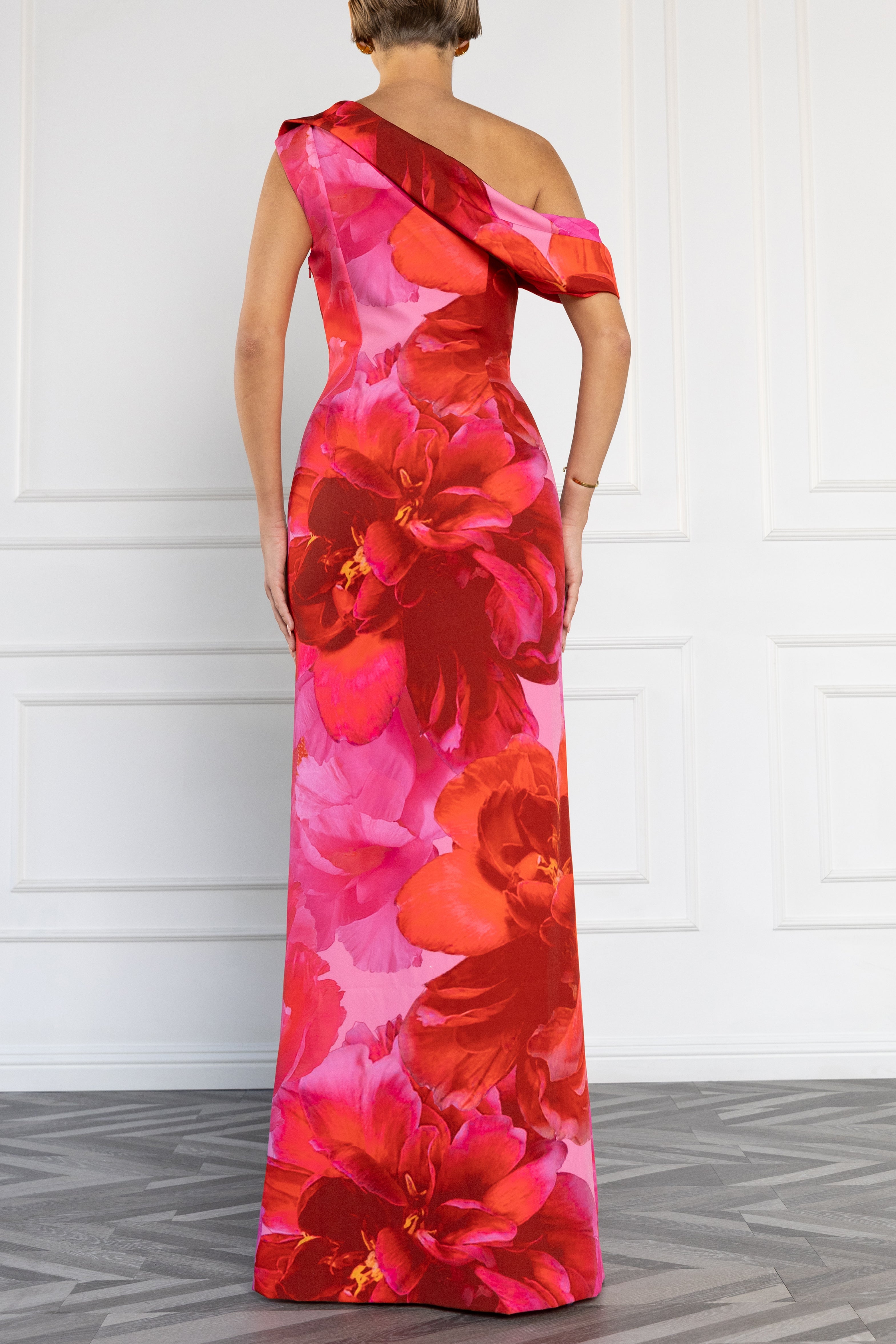 The Evara Gown features a vibrant, tonal poppy print in stretch techno fabric that molds to the body while offering ease of movement. The one-shoulder neckline is softly draped, paired with an off-shoulder sleeve that adds dimension.