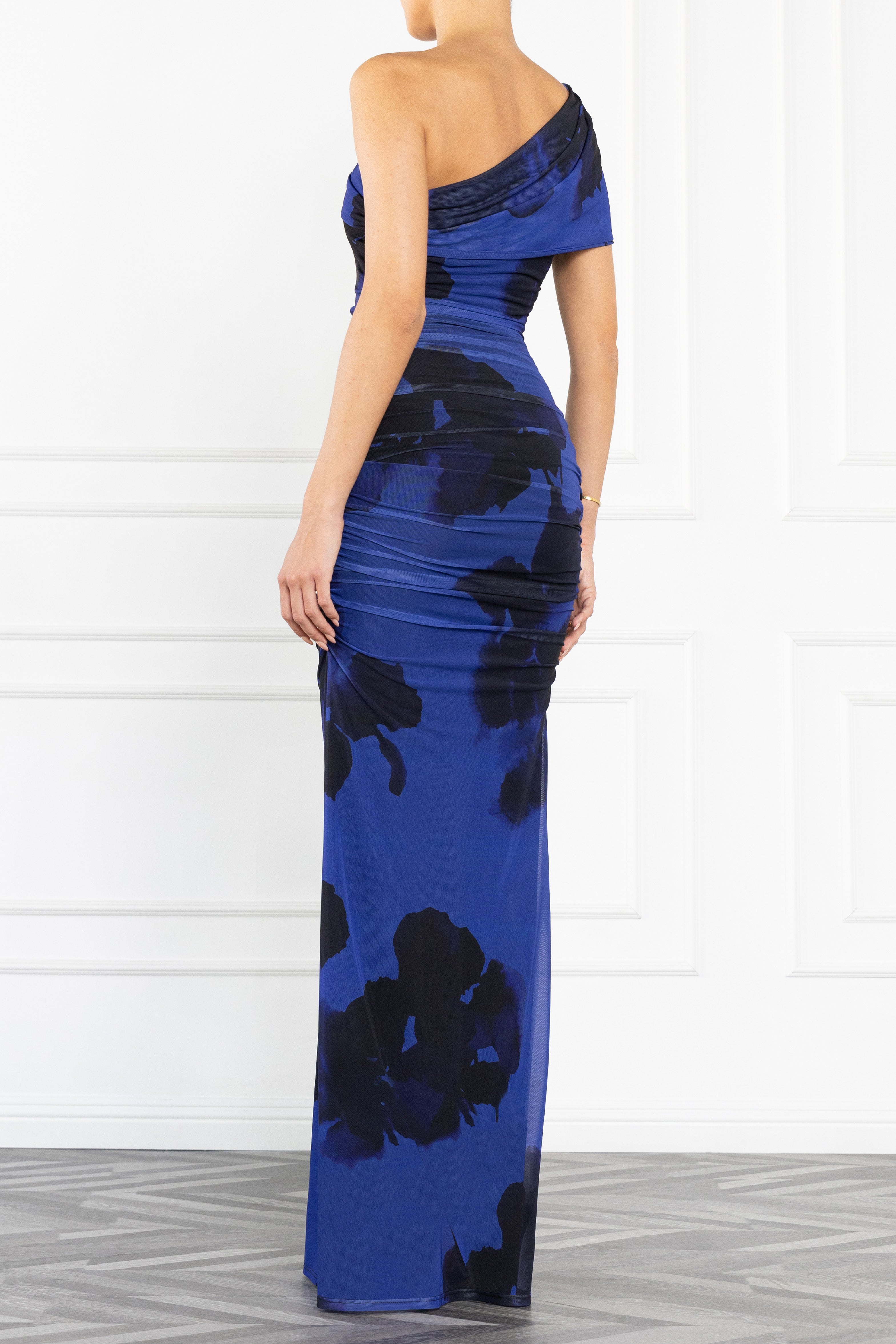 The Rosario Maxi Dress is crafted in abstract floral printed power mesh that hugs your curves with refined ease. The one-shoulder neckline is enhanced by a soft draped overlay, while delicate shirring through the side seams sculpts and smooths the body. Floor-length and fully lined