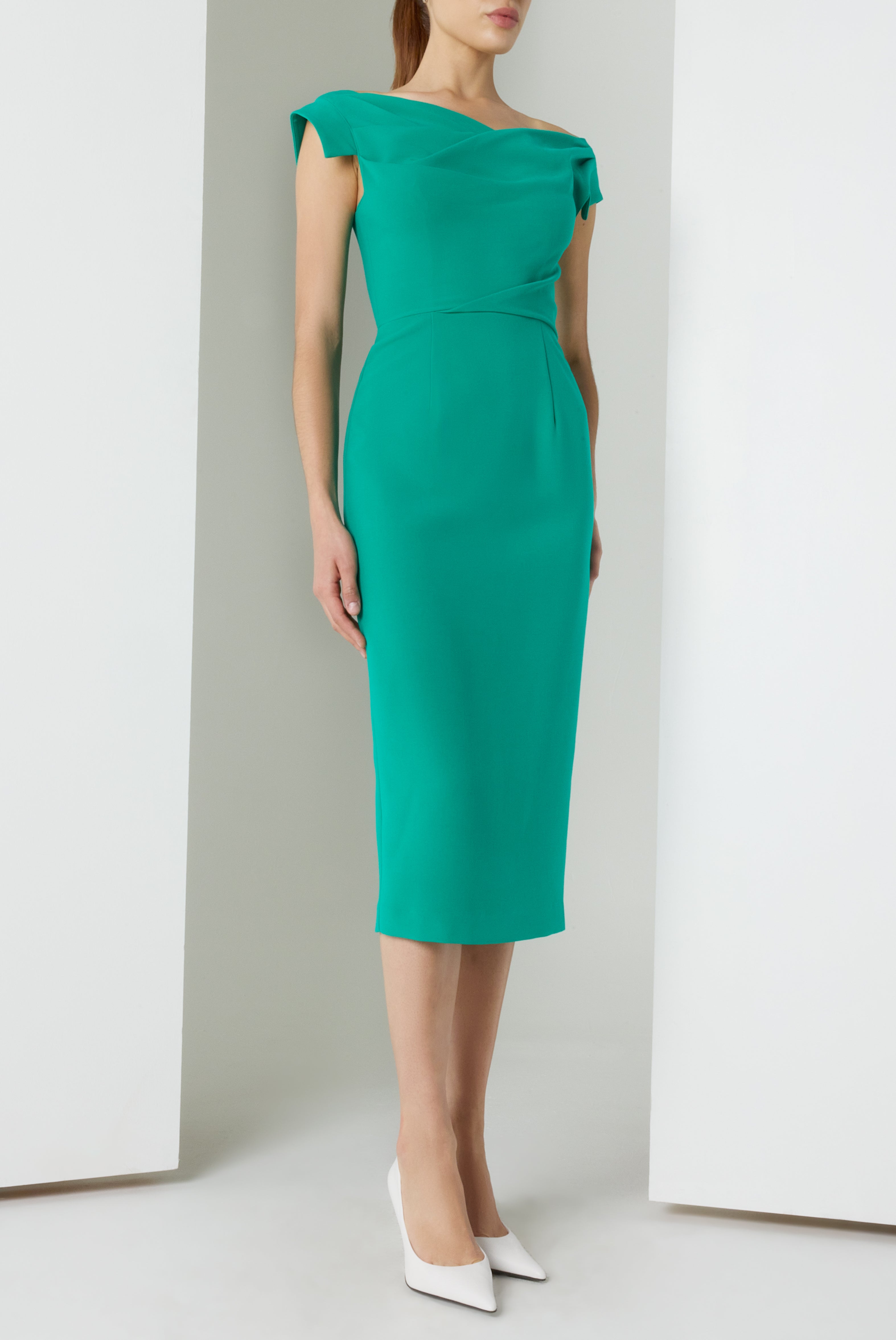 A modern take on a timeless silhouette, the Jacqueline midi dress is the reimagined evolution of our iconic Jackie O. Designed for 2025, this style blends refined tailoring with sculptural draping, creating a sleek, confident look. Crafted from structured stretch super loft woven, it features an off-shoulder neckline with soft tucks that frame the bodice, leading into a streamlined pencil skirt. The fitted design flatters the natural shape, making it a go-to choice for elevated occasions.