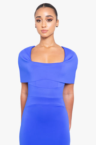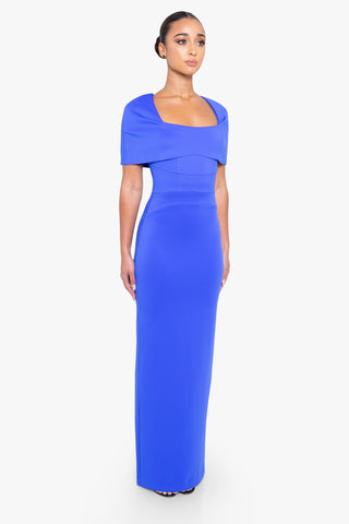 The Bernice Gown blends sculptural lines with a dramatic silhouette. The fitted bodice is styled with an attached mini cape sleeve, creating the illusion of a strong-shouldered, cape-like effect. Waist-defining seams and the structured stretch knit fabric work together to flatter the figure, while a back slit ensures ease of movement. This is a statement piece designed for elevated evenings and red-carpet moments.