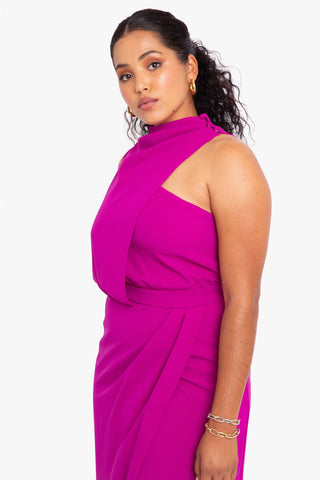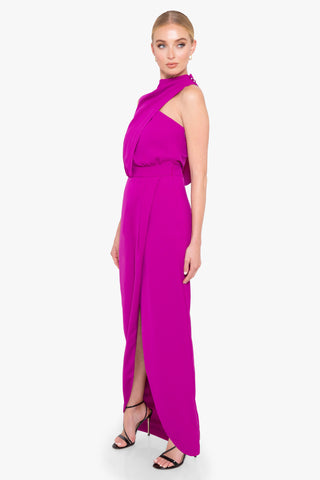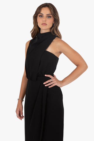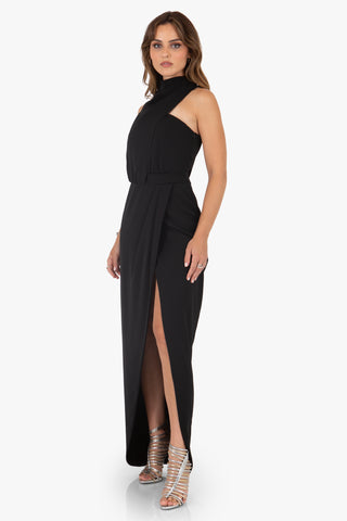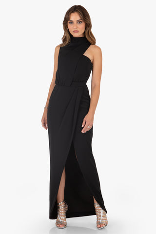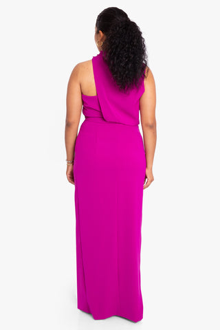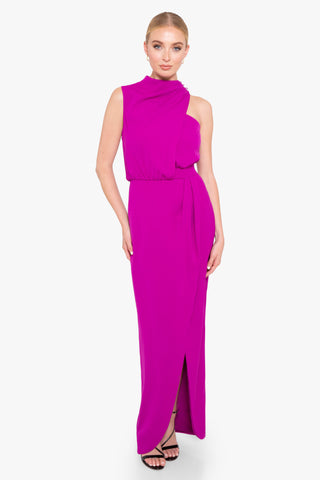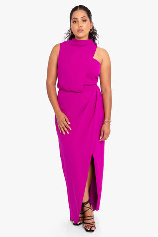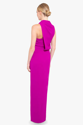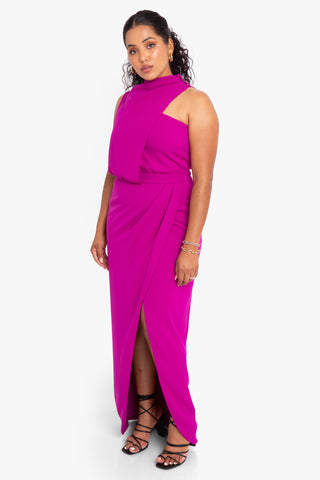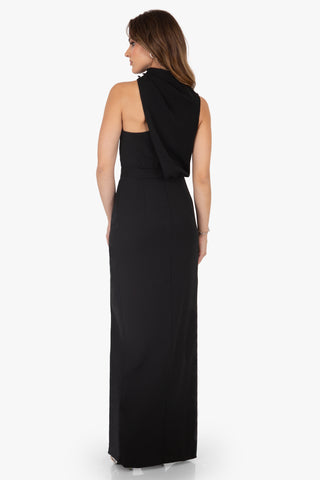 The Floella Gown is designed to make an entrance. Featuring a graceful cowl neckline that flows into a one-shoulder silhouette, the bodice is elevated with an artfully draped panel that adds dimension and fluidity. A side slit creates movement through the column skirt, while the invisible side zipper ensures a smooth finish. Perfect for formal events, red carpet moments, or unforgettable evenings out.