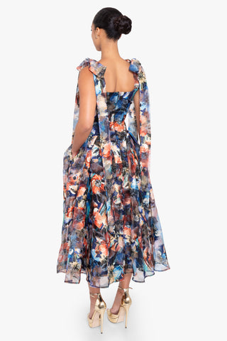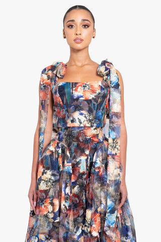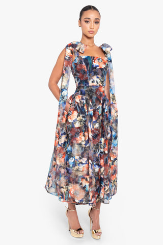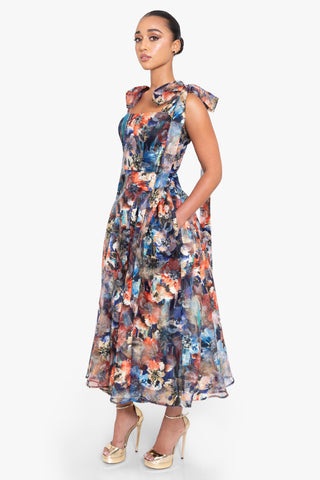 Crafted to move with ease and grace, this midi dress is a standout expression of the Black Halo It Girl. Designed in a luminous printed jacquard organza with subtle touches of lurex, the silhouette is equal parts playful and refined. Long self-tie straps add a flirty, customizable finish, while a fitted bodice and voluminous midi skirt bring structure and drama. With hidden side pockets for a practical twist, this dress is ready to turn heads at every occasion.