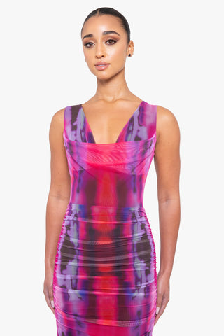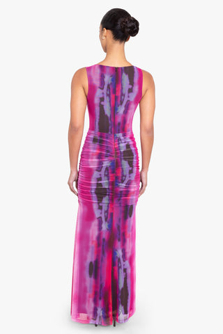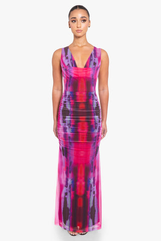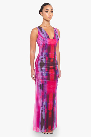 Indulge in vibrant charm with our stunning multicolored maxi dress, a masterpiece of color and comfort. Designed to captivate, its bold hues create a striking visual appeal that is perfect for dinner parties or an evening out. The printed mesh fabric drapes beautifully.