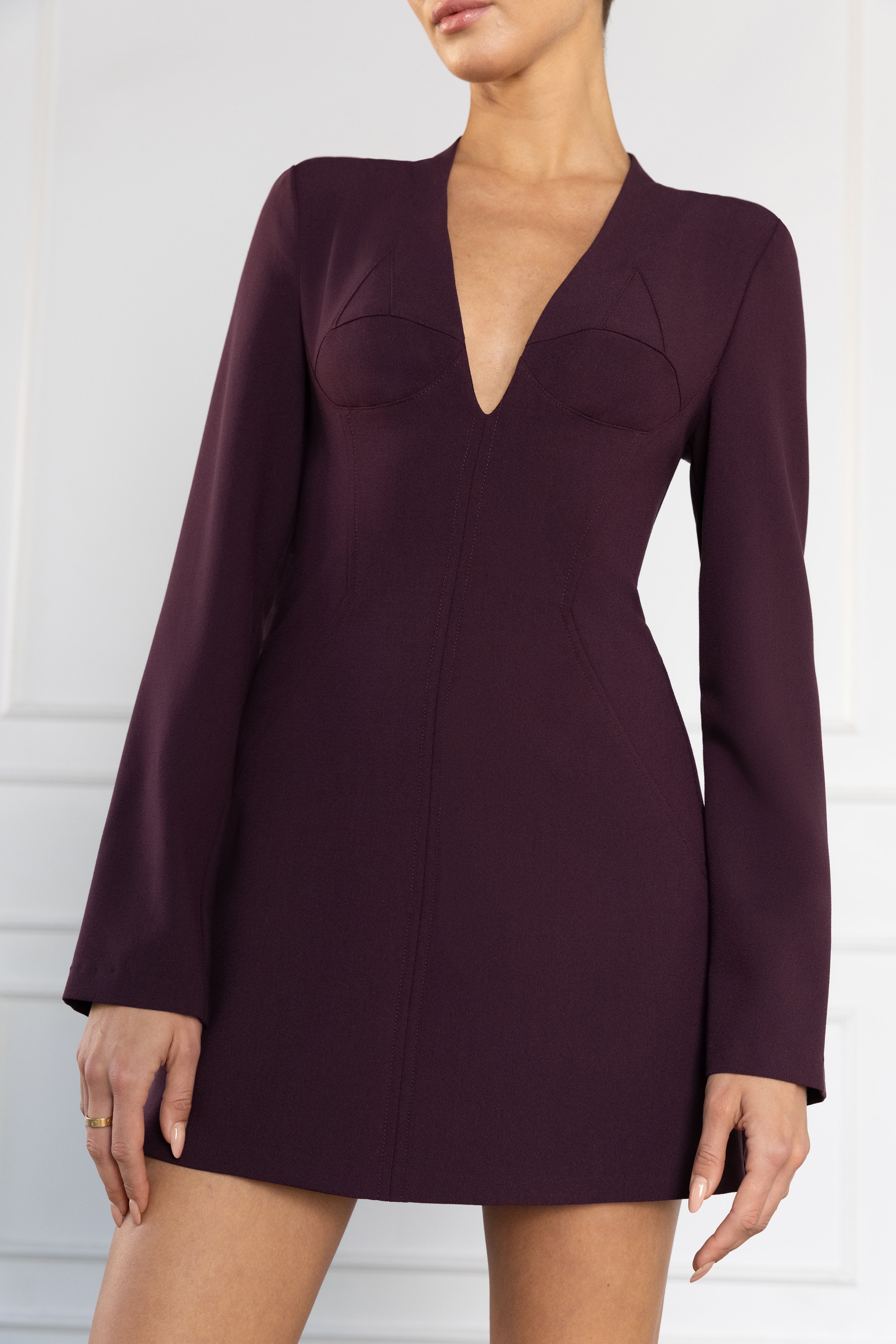 The Kenna Micro Mini Dress makes a bold entrance with a deep plunge neckline and sleek long sleeves. The structured underbust seam enhances the silhouette while adding subtle shape to the tailored bodice. Cut to a micro-mini length, it’s fully lined for a smooth finish and secured with a hidden center back zipper