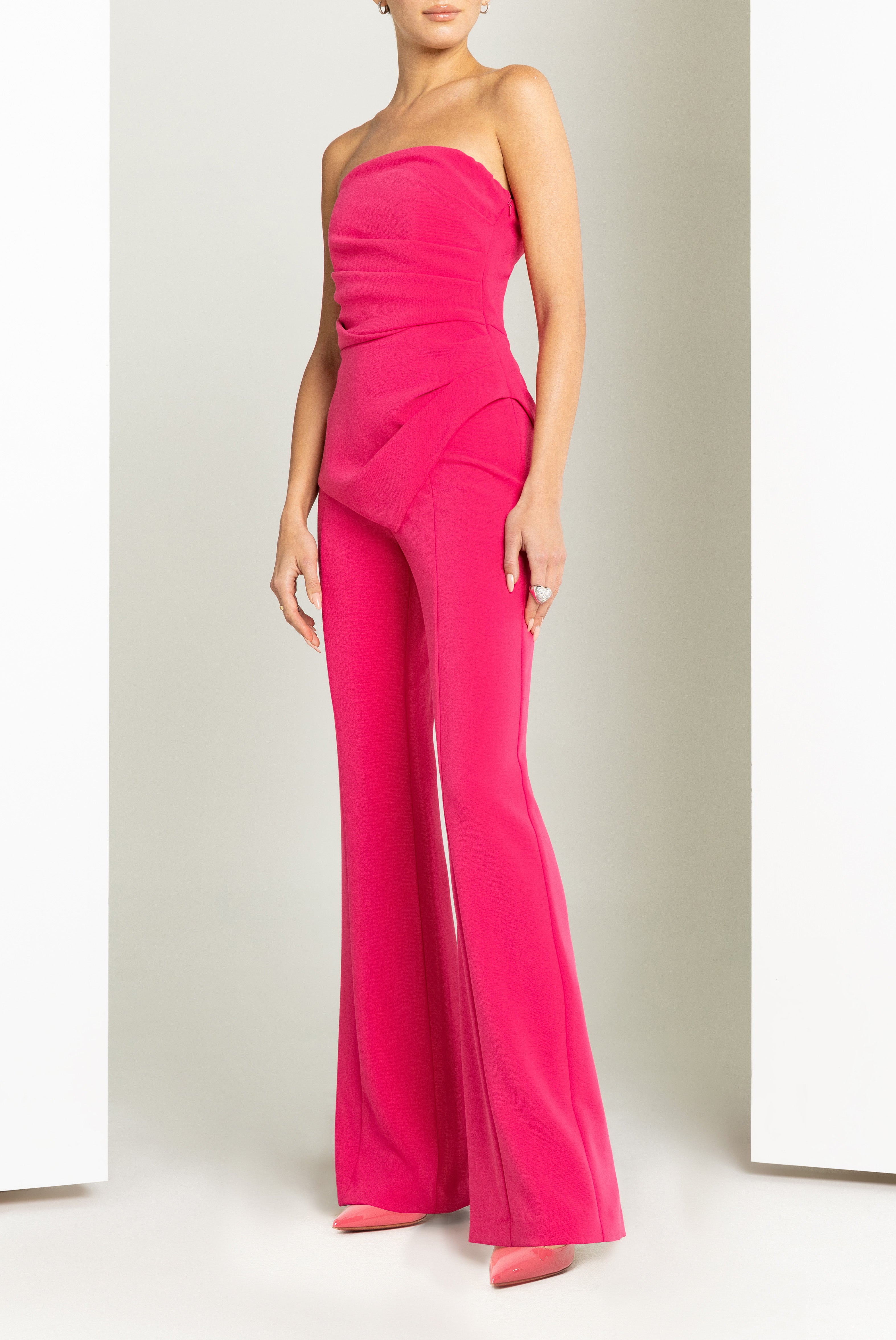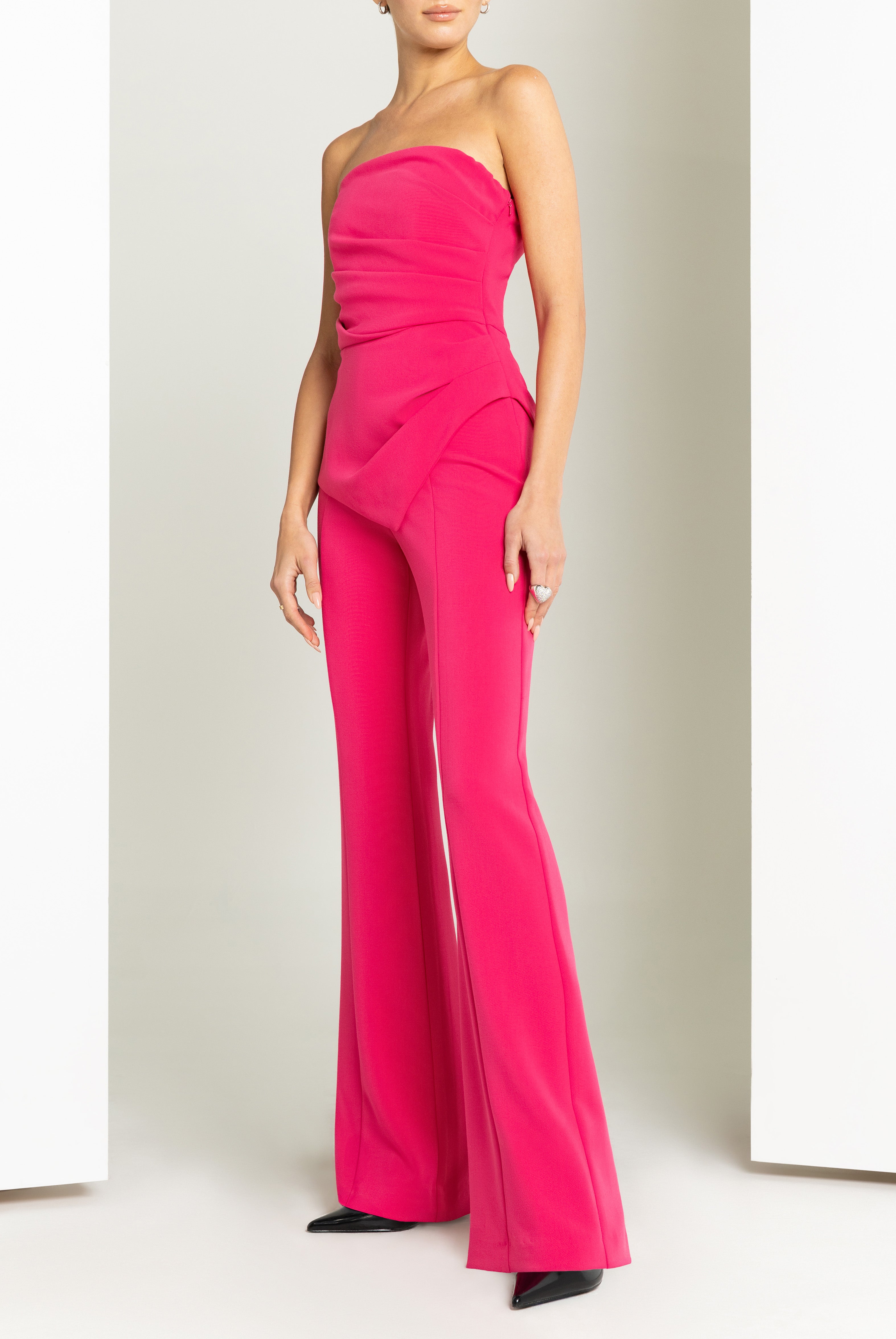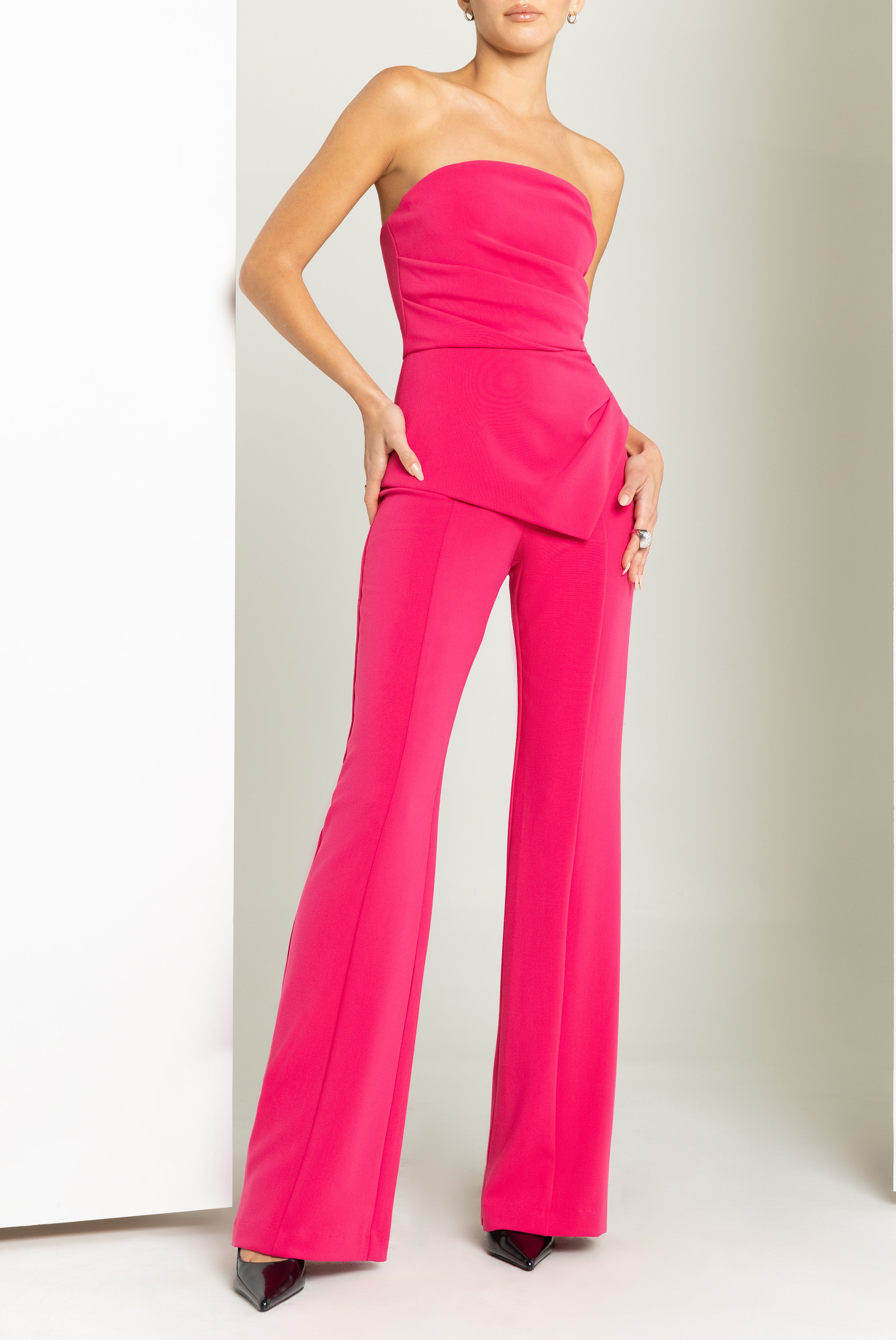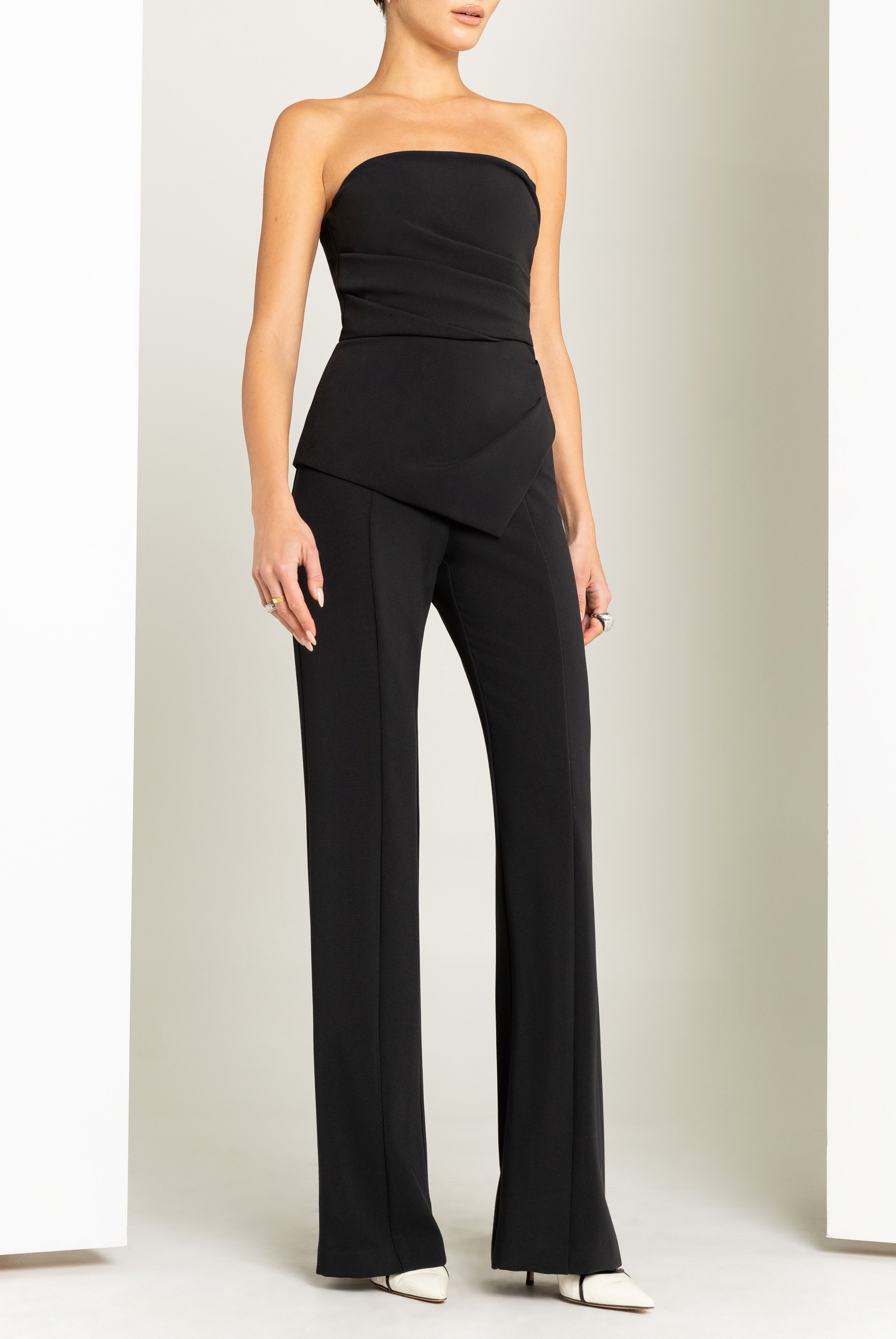 The Rockie Jumpsuit is crafted from a stretch super loft woven fabric that molds beautifully to the body while allowing for movement and structure. The strapless bodice is detailed with sunburst tucks for subtle dimension, balanced by an asymmetrical peplum that defines the waist. A straight-leg pant with elongating center front seams completes the silhouette.