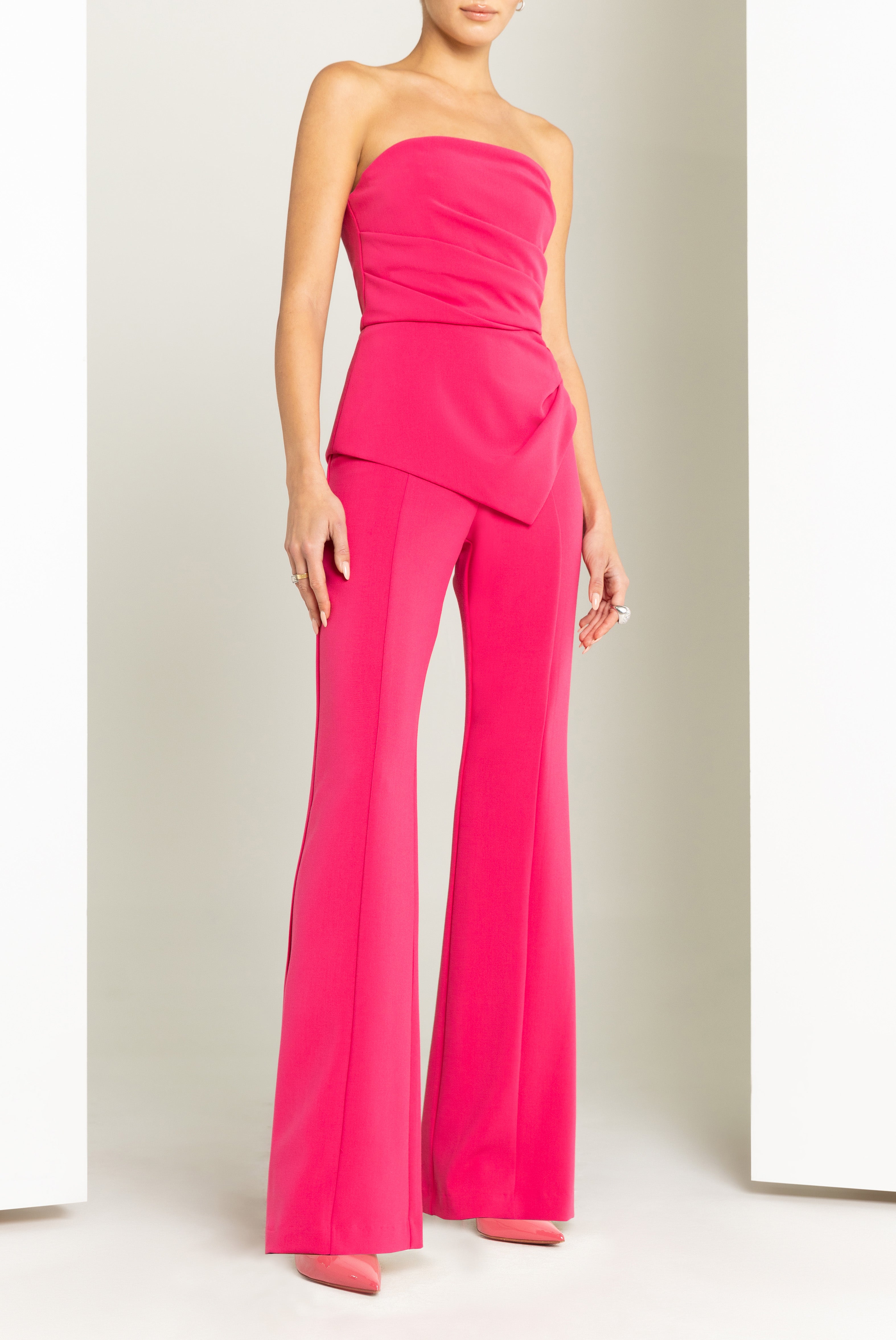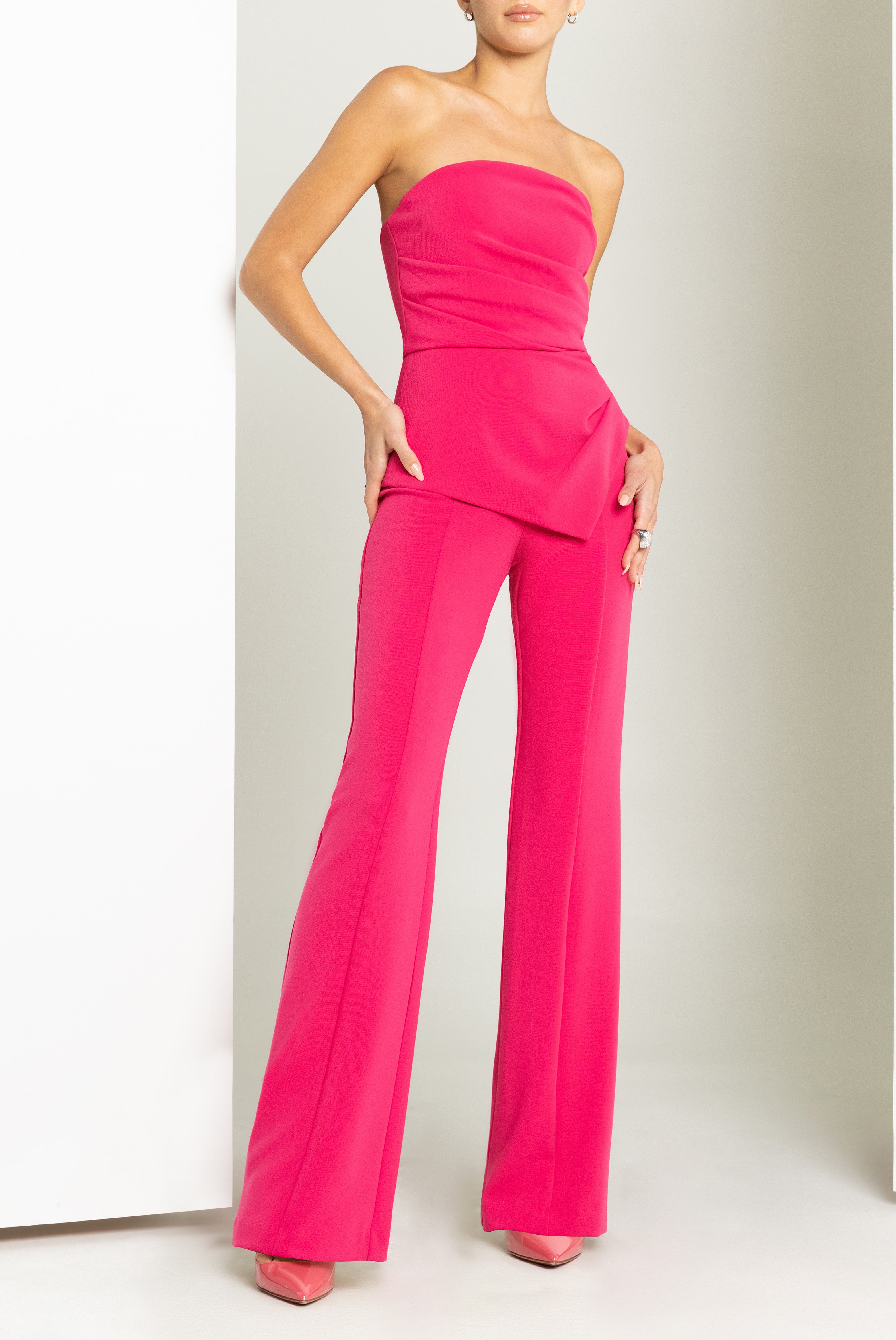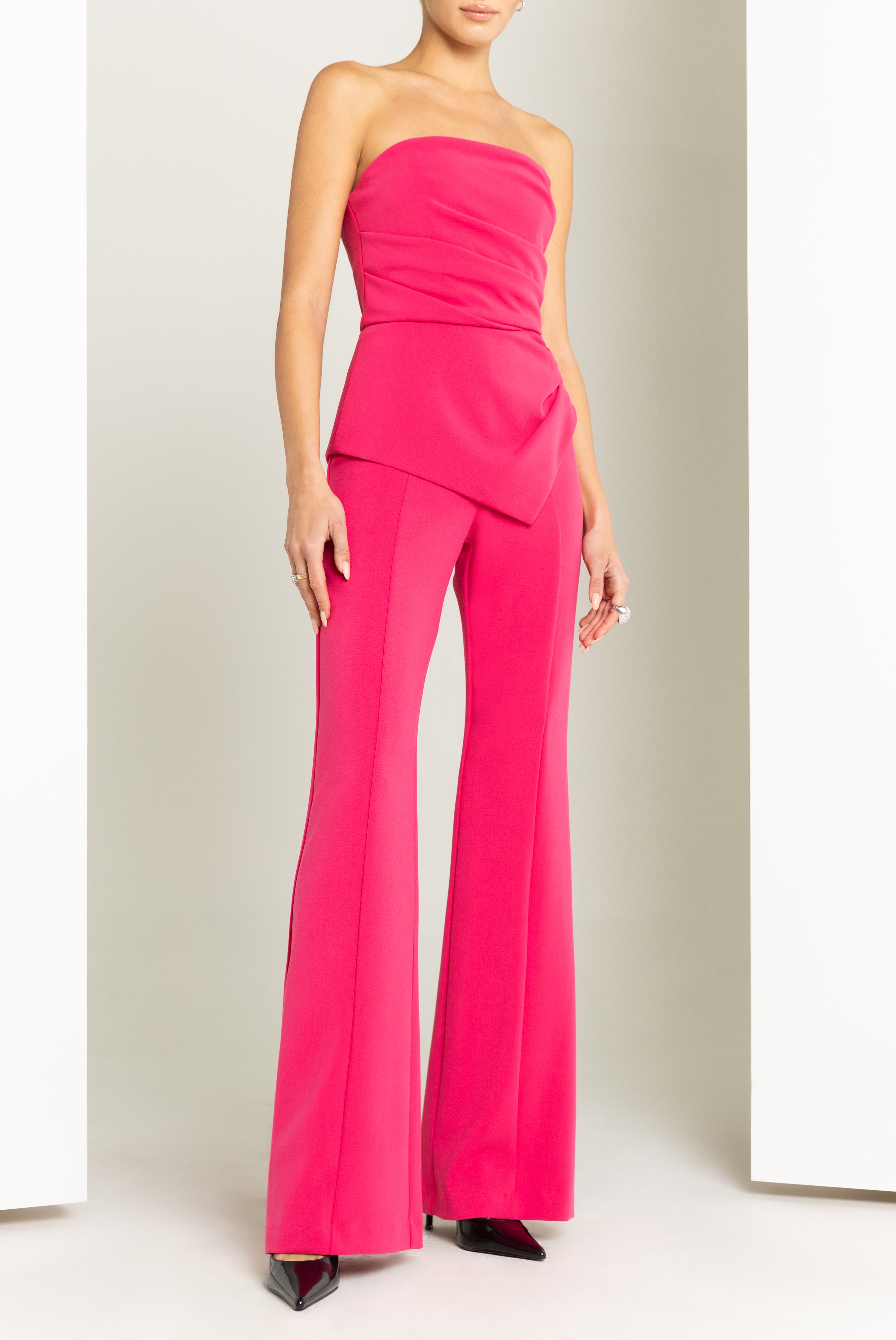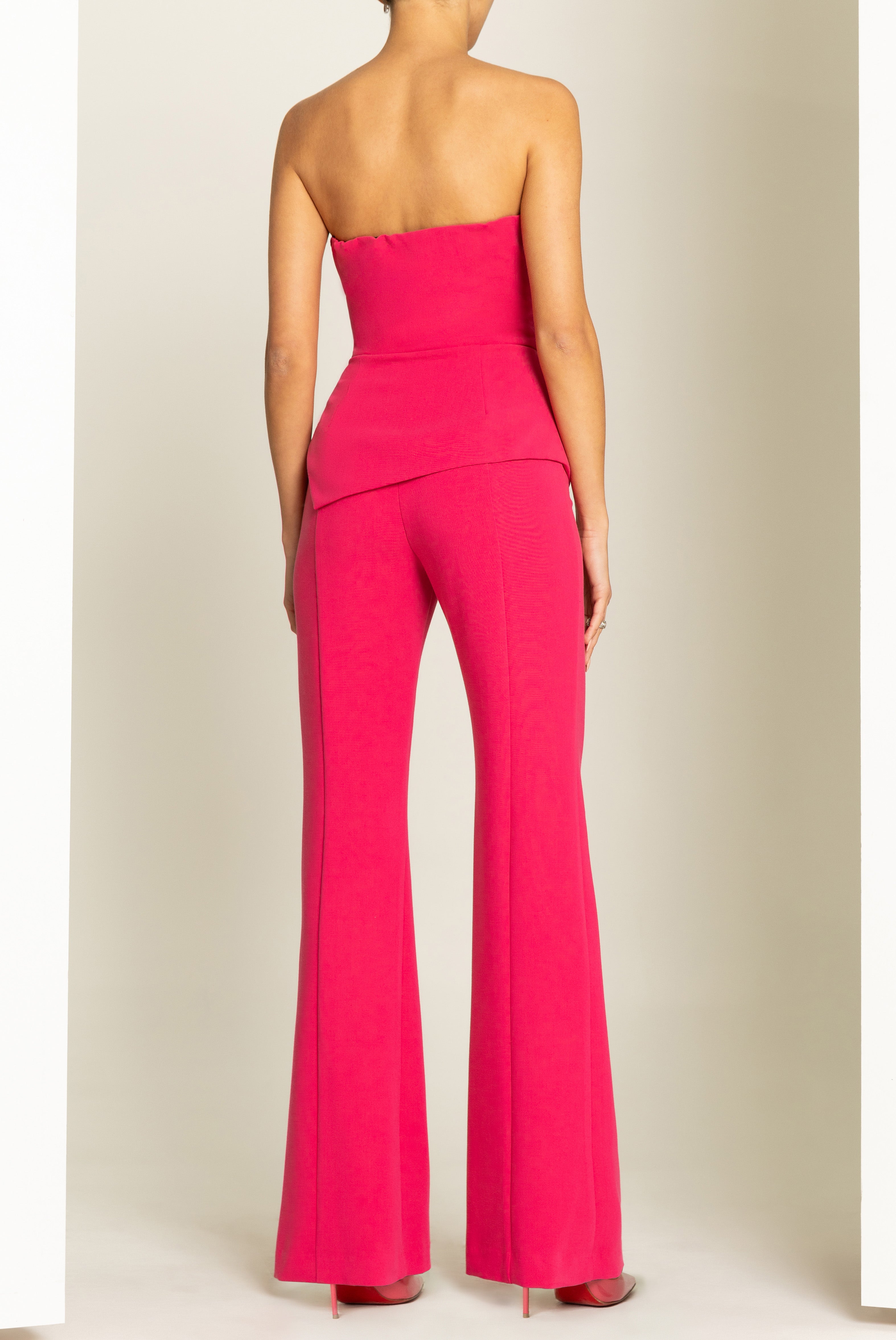 The Rockie Jumpsuit is crafted from a stretch super loft woven fabric that molds beautifully to the body while allowing for movement and structure. The strapless bodice is detailed with sunburst tucks for subtle dimension, balanced by an asymmetrical peplum that defines the waist. A straight-leg pant with elongating center front seams completes the silhouette.