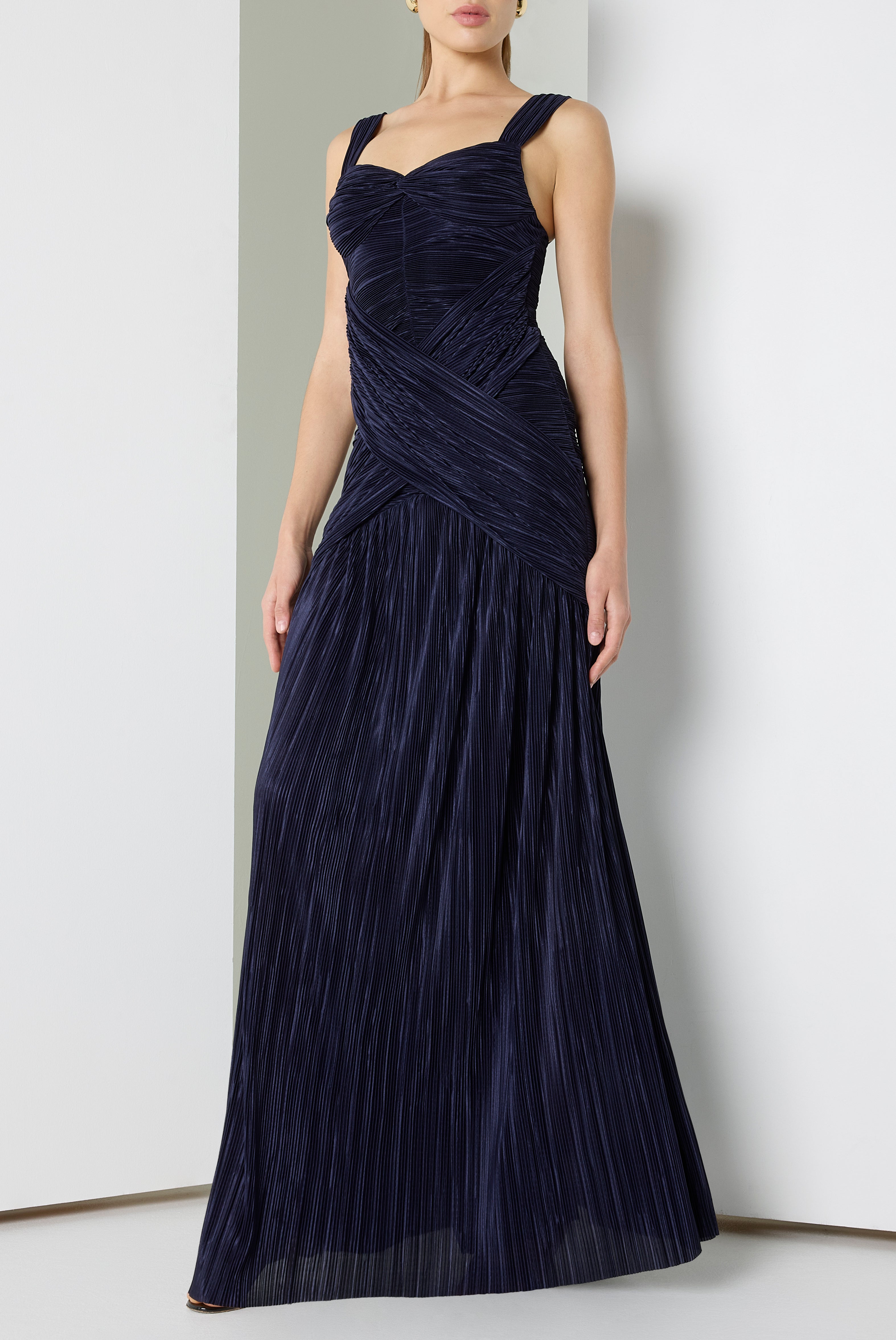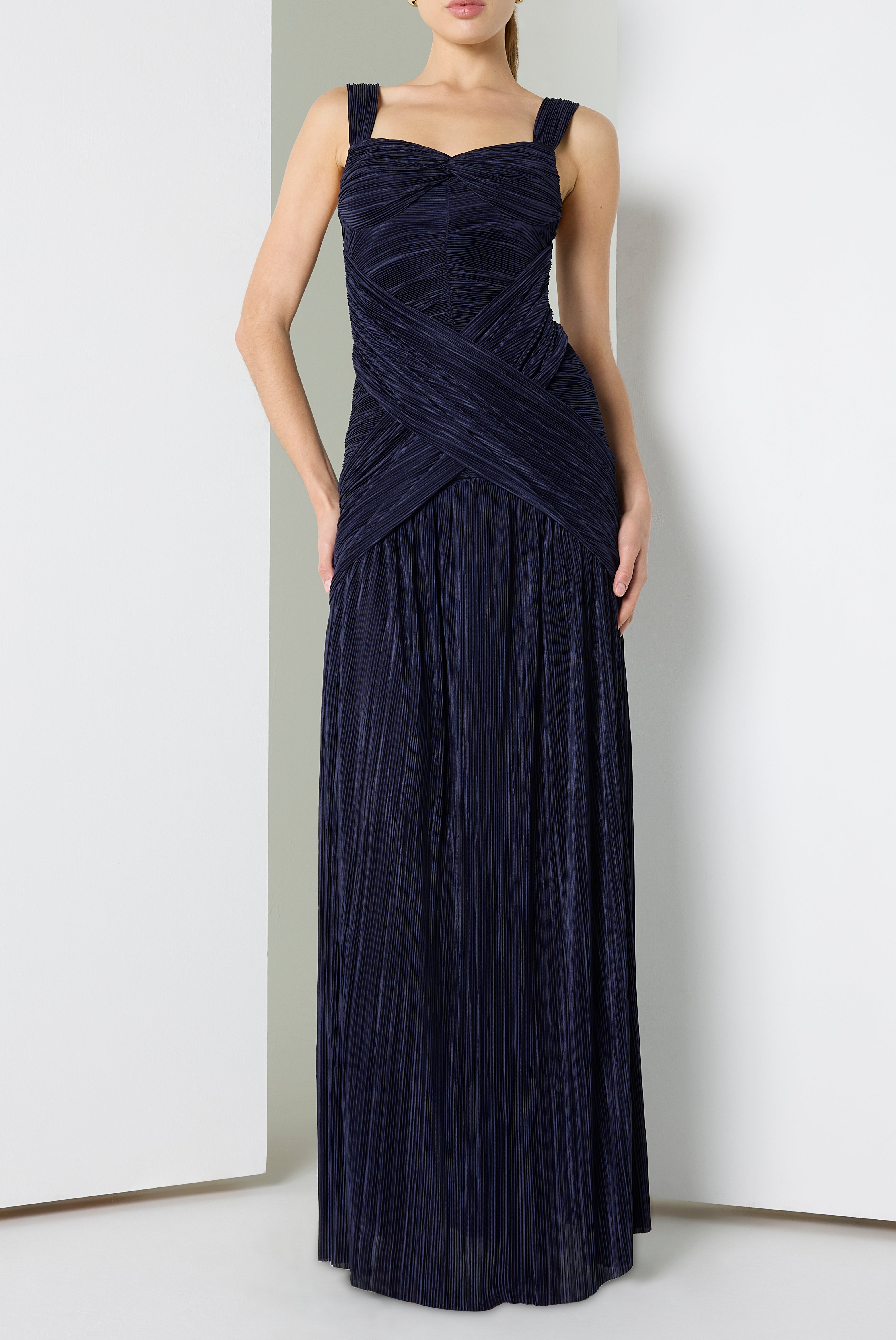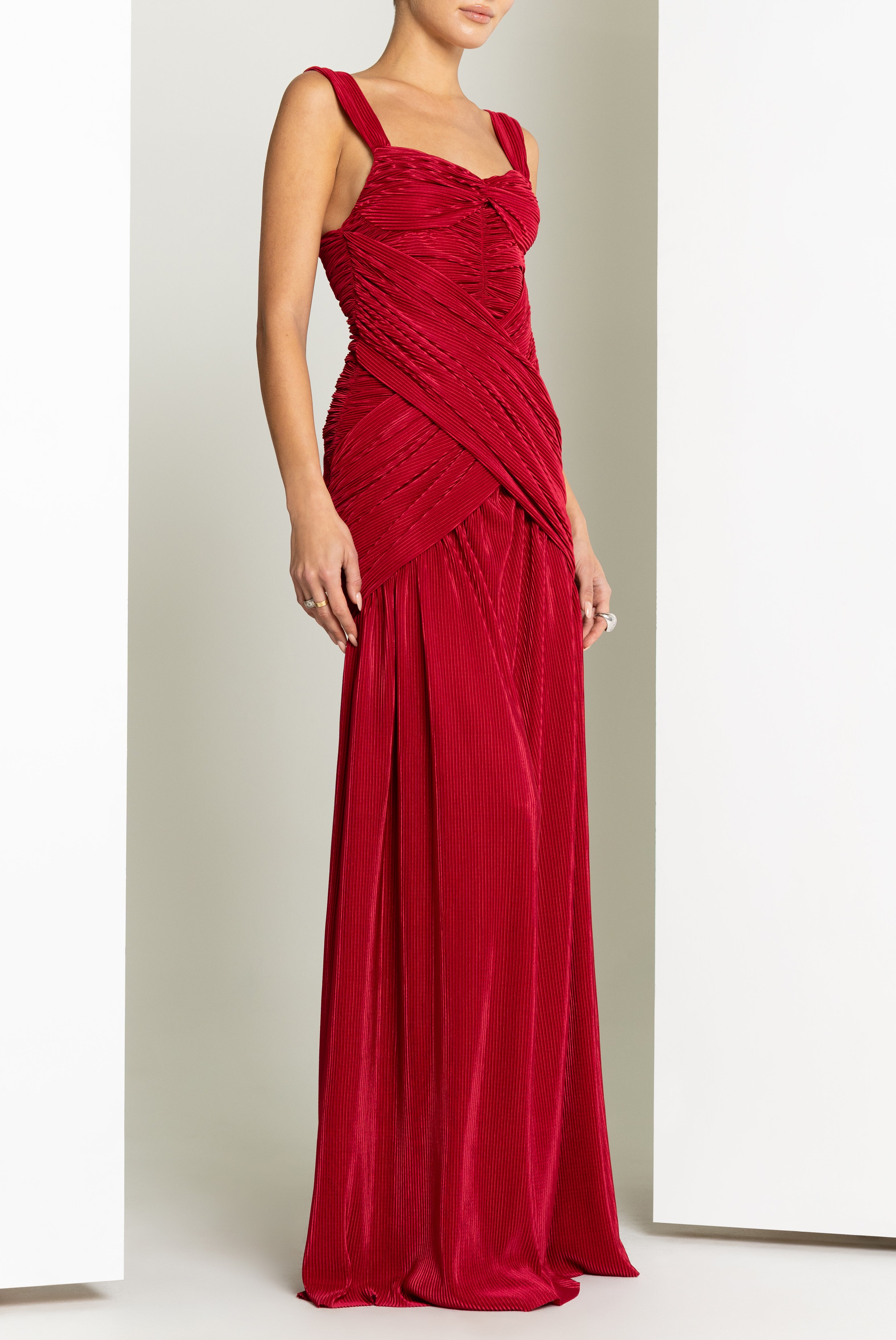 The Zia Gown is designed in textured plissé fabric that creates depth and movement throughout the silhouette. Wide straps frame the neckline while a twist detail at the bust adds sculpted shape to the bodice. Draping at the center front enhances the fitted waist before flowing into a softly shirred flared skirt, creating a striking full-length look.