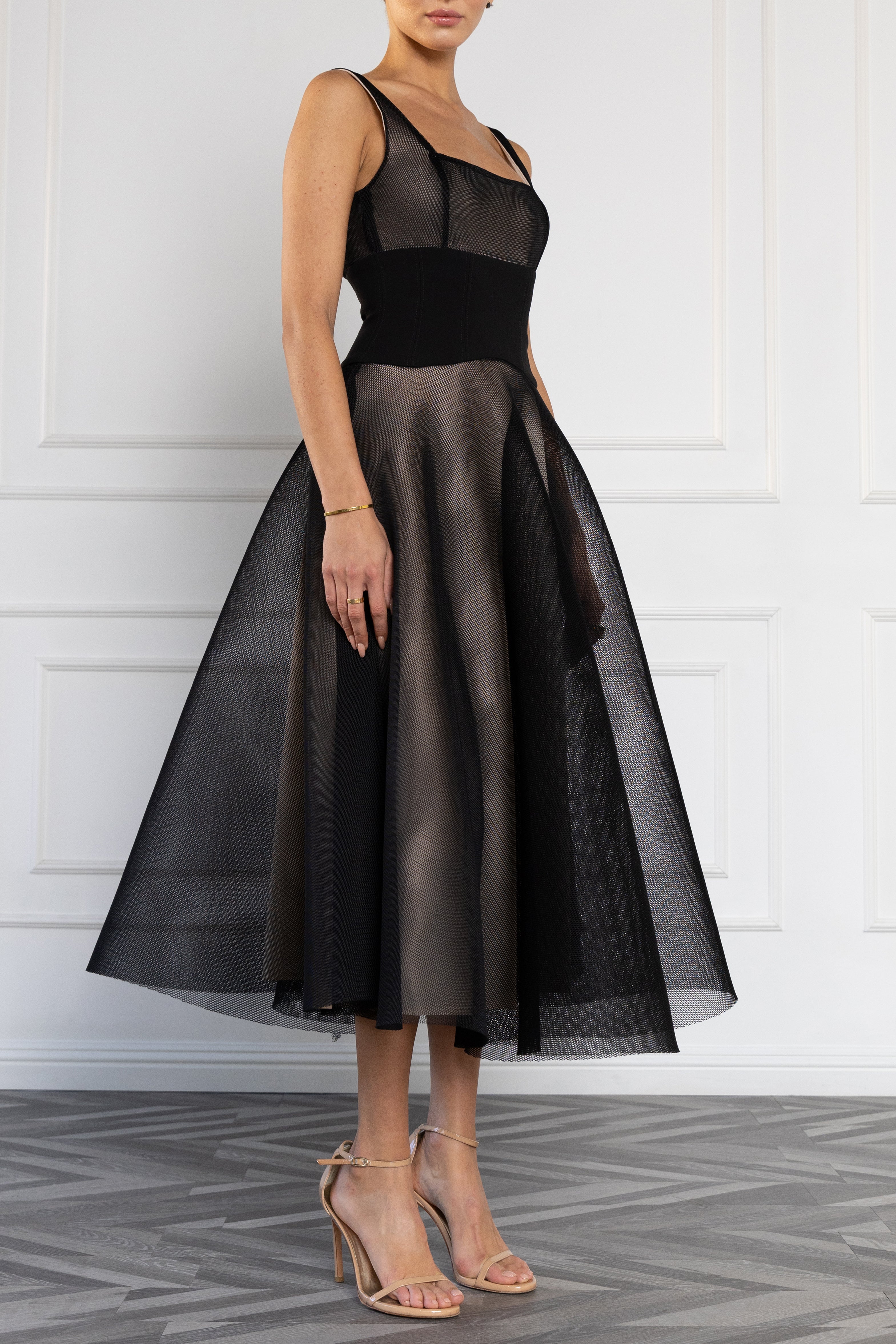 The Vivi Midi Dress is a modern statement in texture and silhouette. Crafted from two-ply bonded mesh, this design plays with opacity and movement. The squared neckline and tapered straps frame the décolletage, while a contrasting corset-style waist defines the shape. The sheer mesh midi skirt reveals a nude lining beneath, offering a layered look