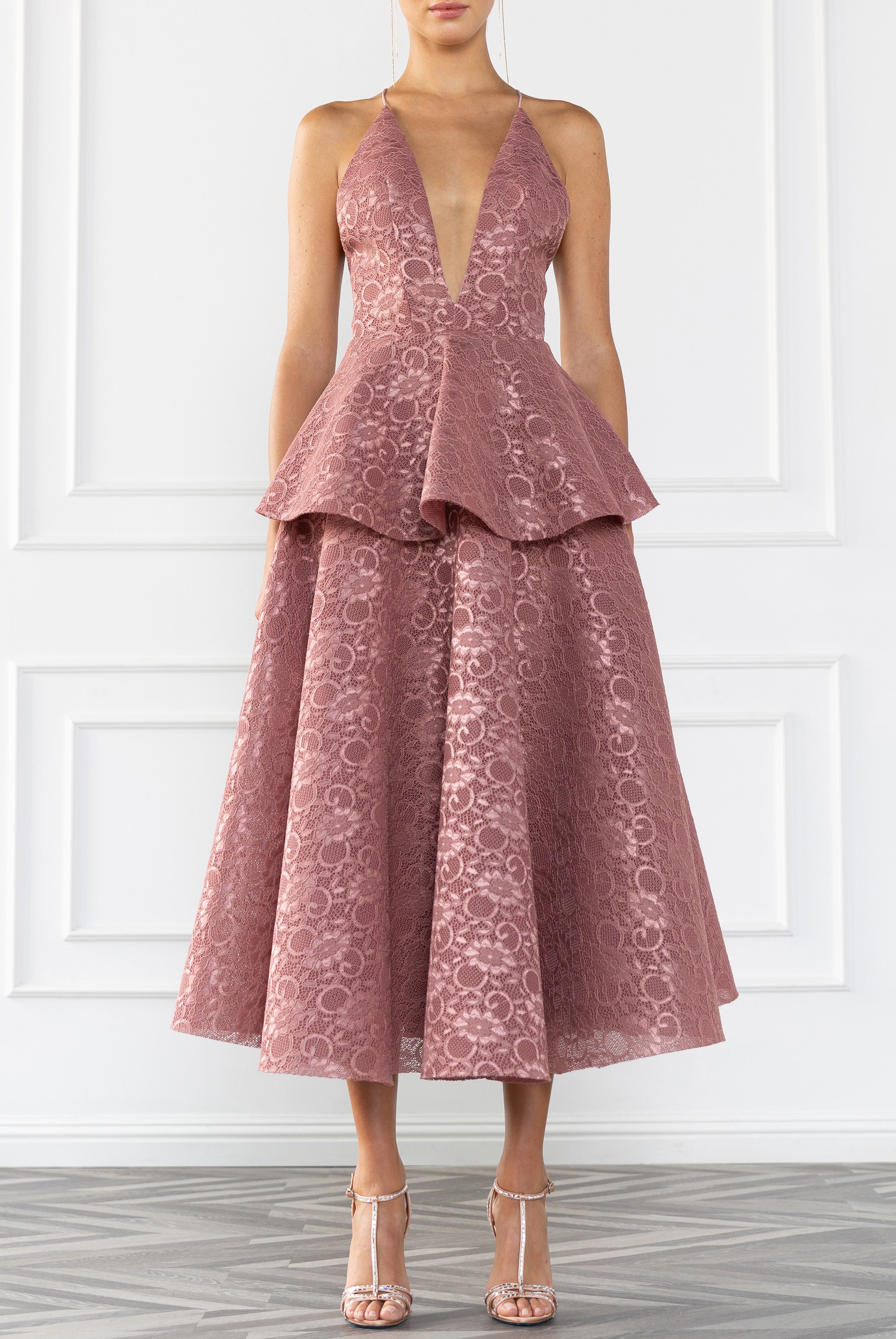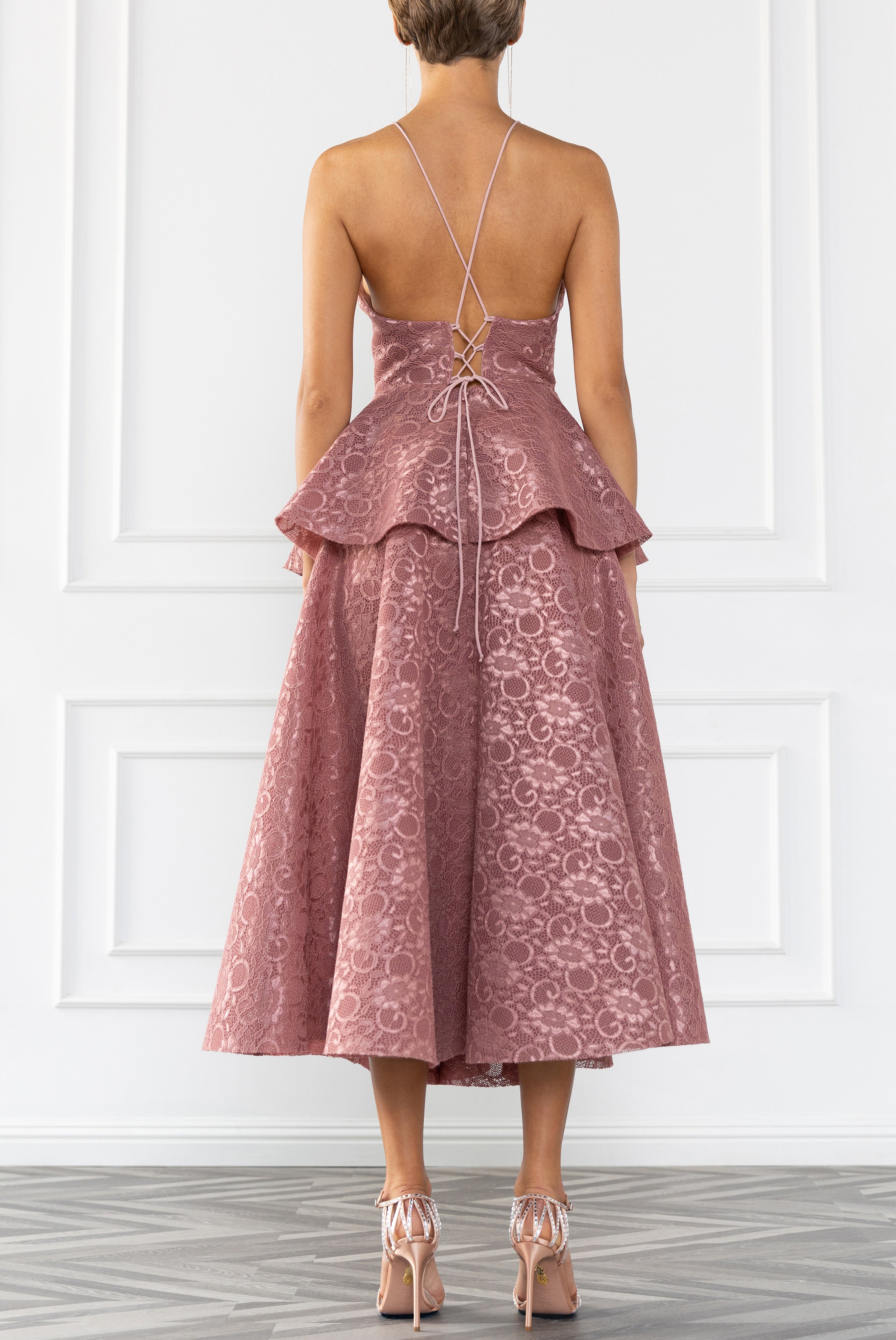 The Almira Midi Dress is crafted from bonded lace, this halter-style design features a plunging V-neckline and an open back with adjustable crisscross spaghetti straps that lace up at the waist for a perfectly tailored silhouette. A peplum accent adds structure, while the full circle skirt brings volume and flow for standout appeal.