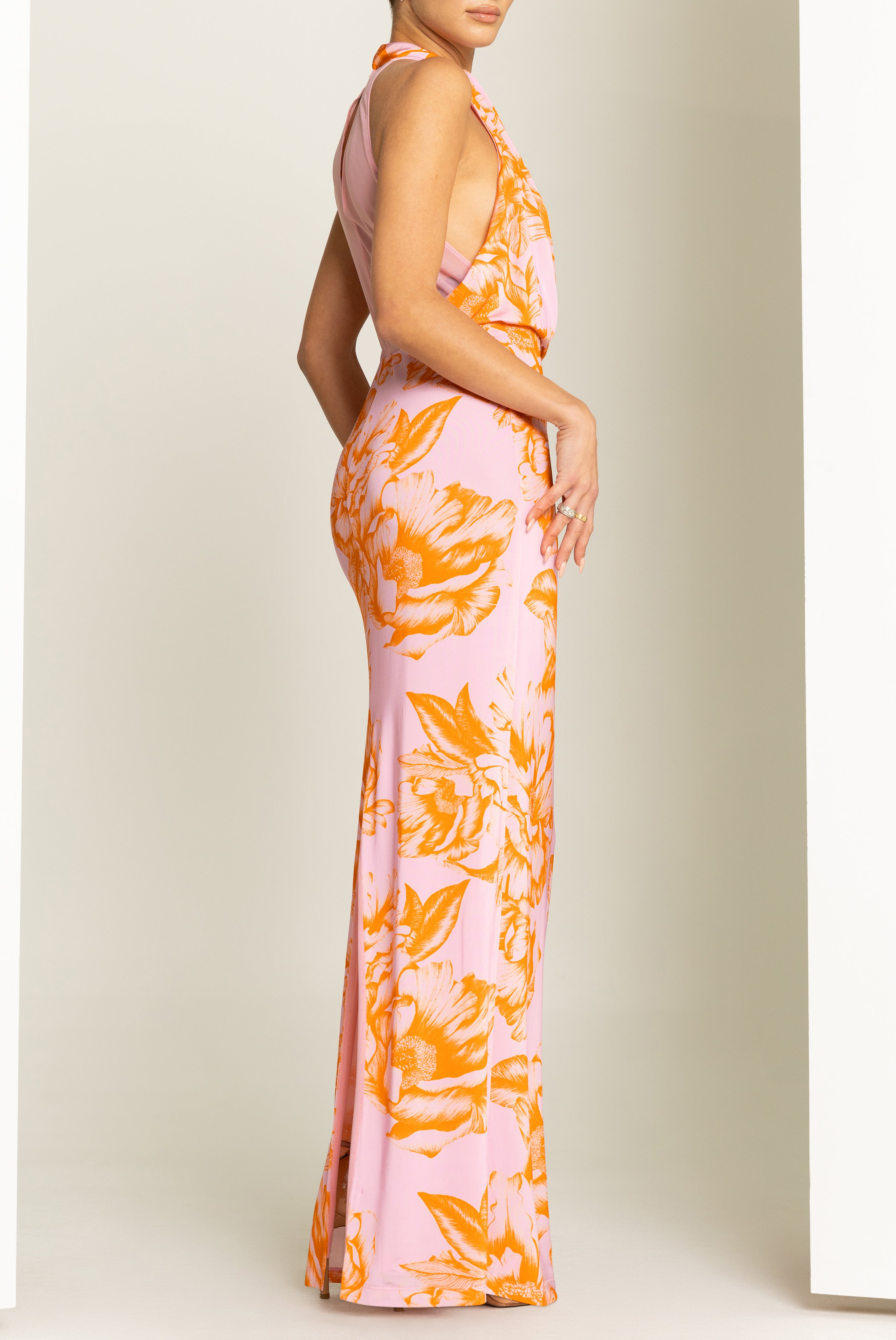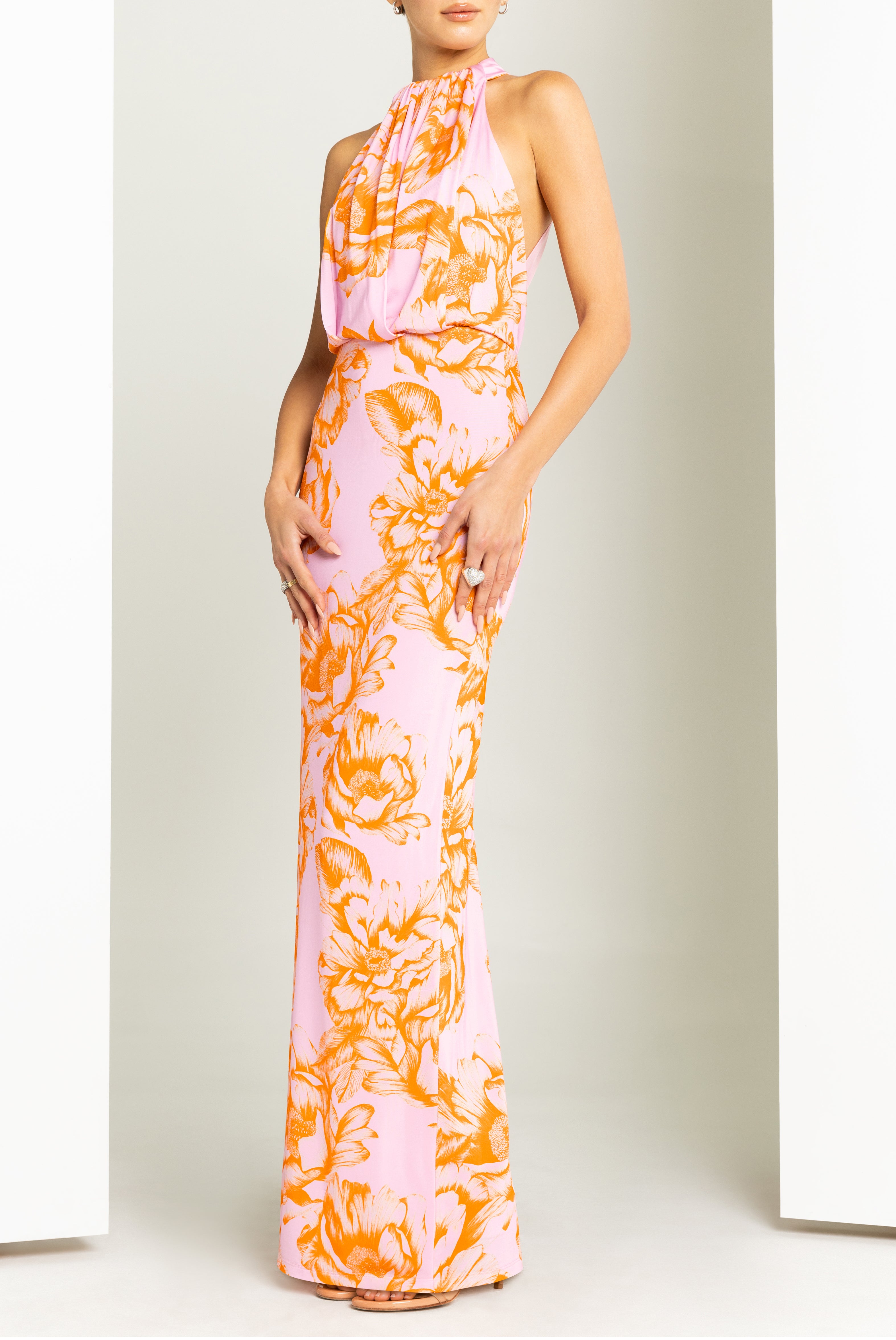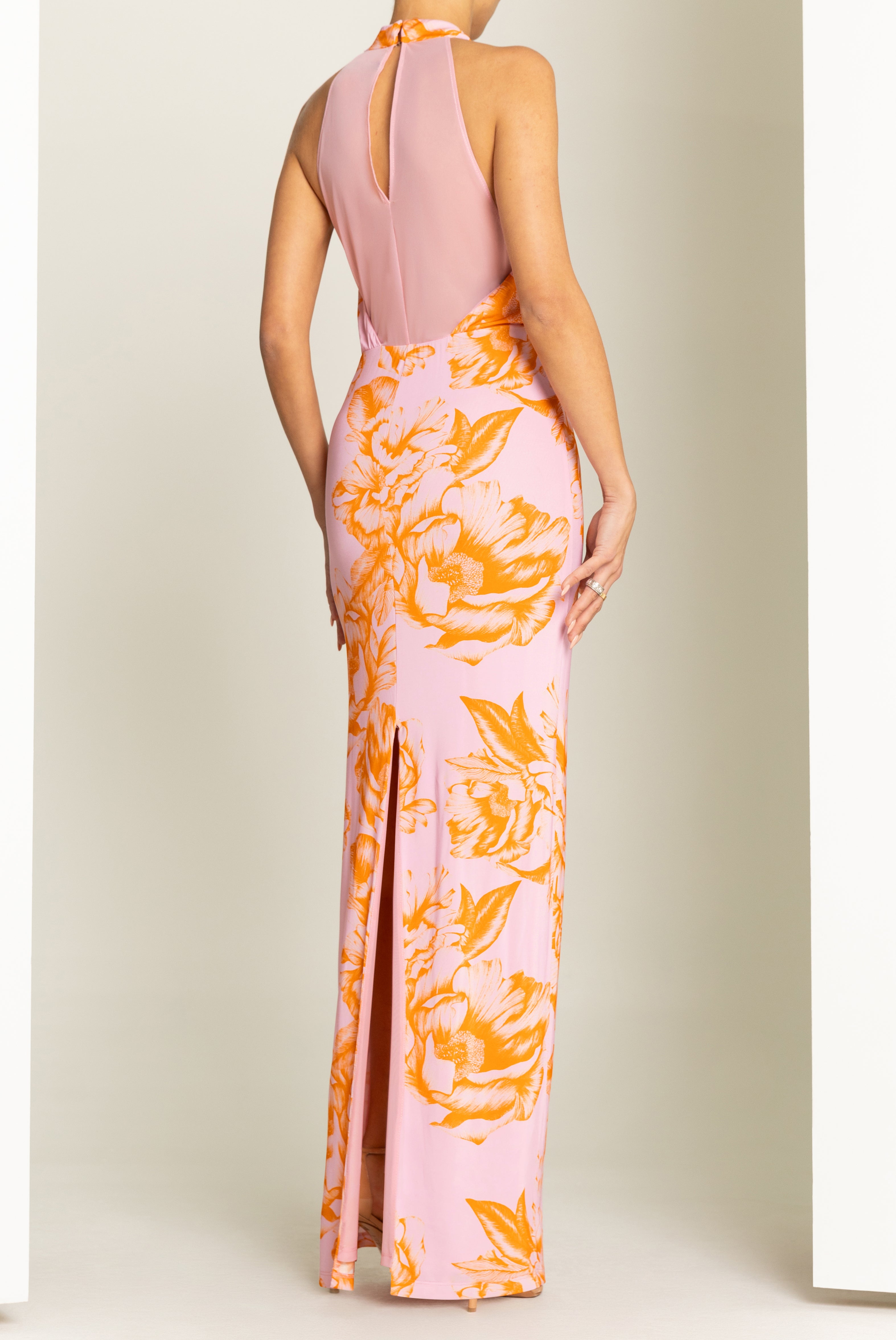 The Elowen Maxi Dress features a sculpted high-neck halter with a softly draped bodice and asymmetrical tucks that contour the frame. A sheer mesh back insert adds subtle allure, while the column skirt elongates the silhouette. Effortless to wear with a pull-on construction and delicate back-neck button closure.