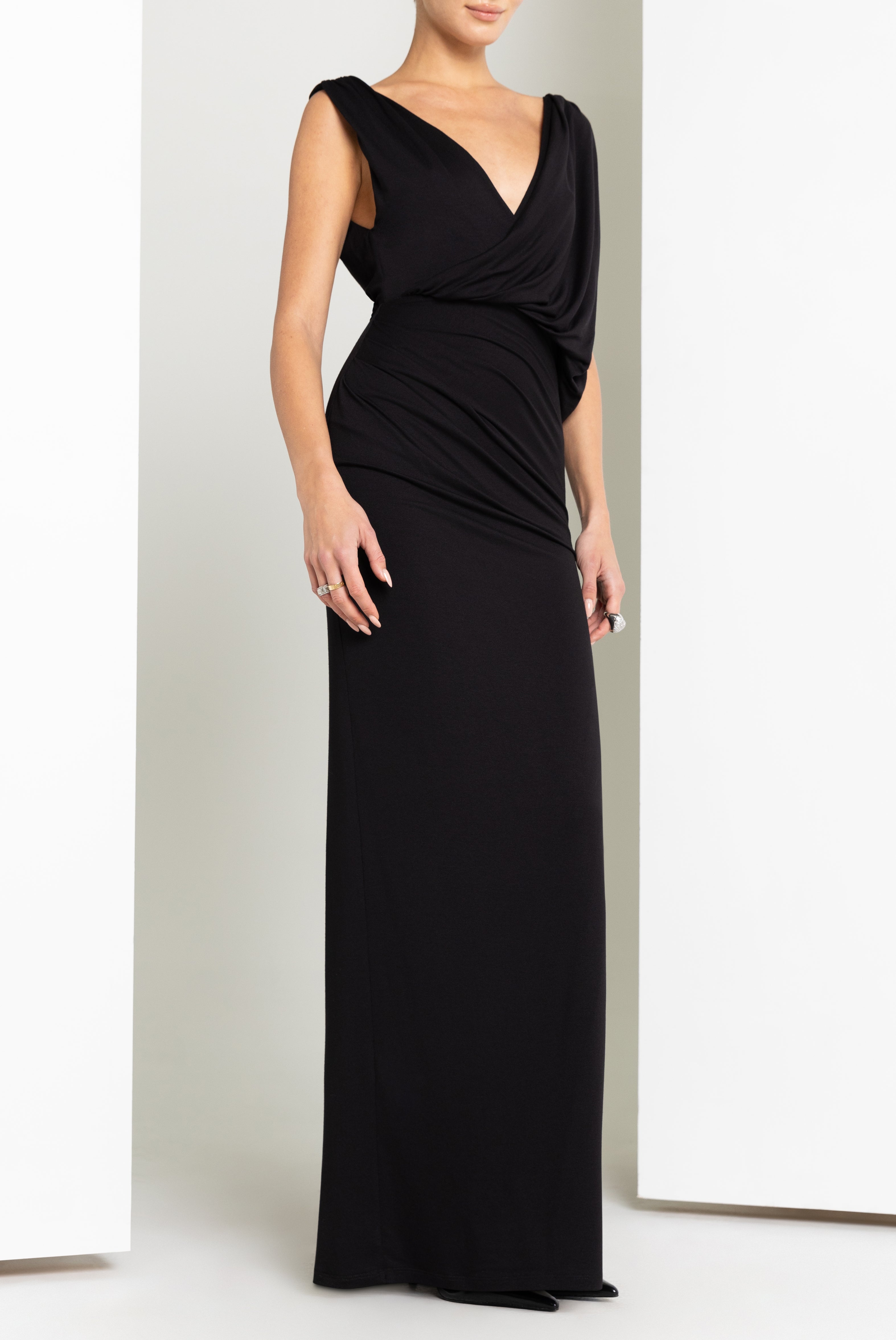 The Norissa Maxi Dress is designed to move with you. The asymmetric V-neckline flows into a draped overlay bodice that gathers delicately at the shoulders. With a column silhouette and side seam slit, it elongates the frame while remaining effortless to wear—no zippers required. Just step in and go.