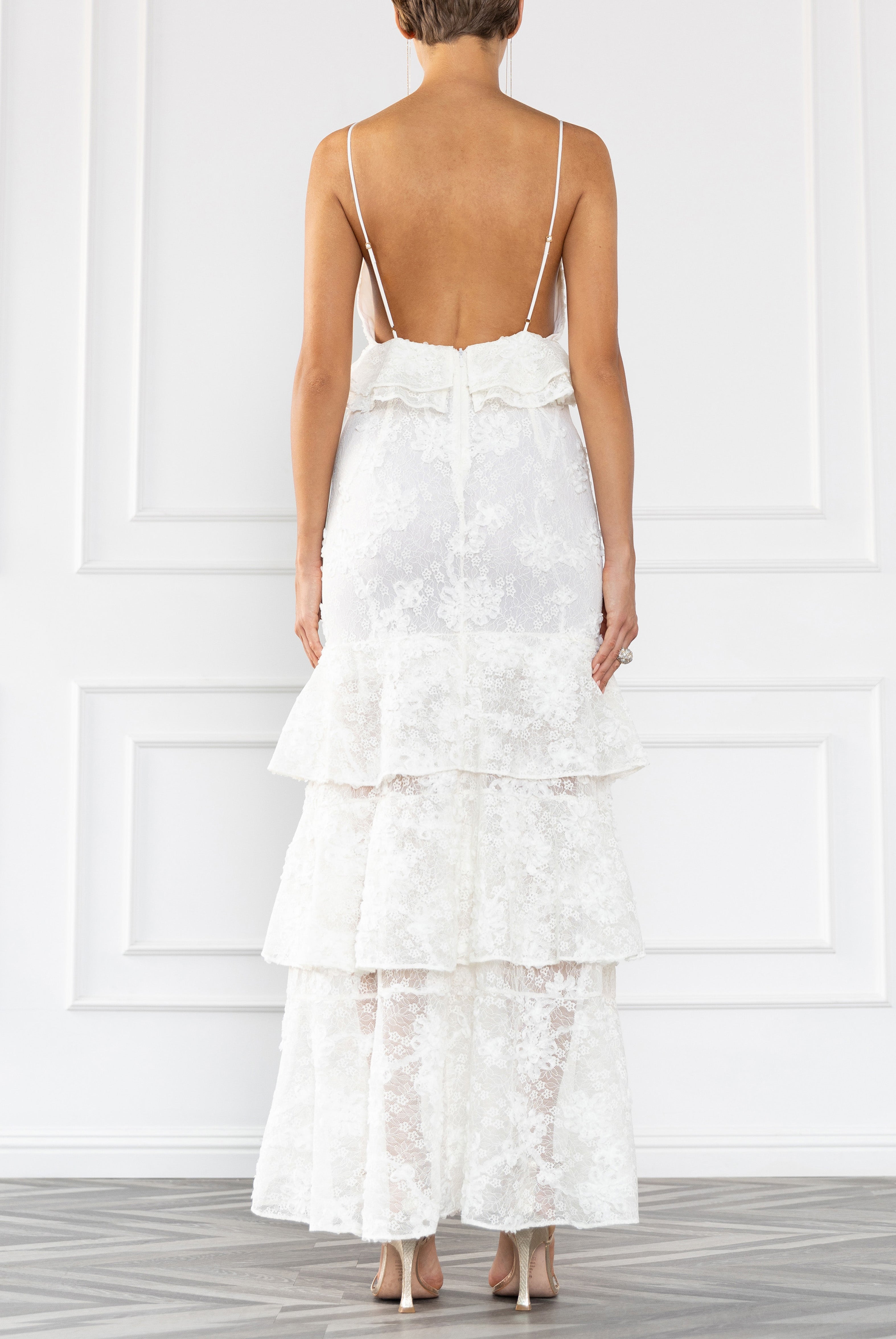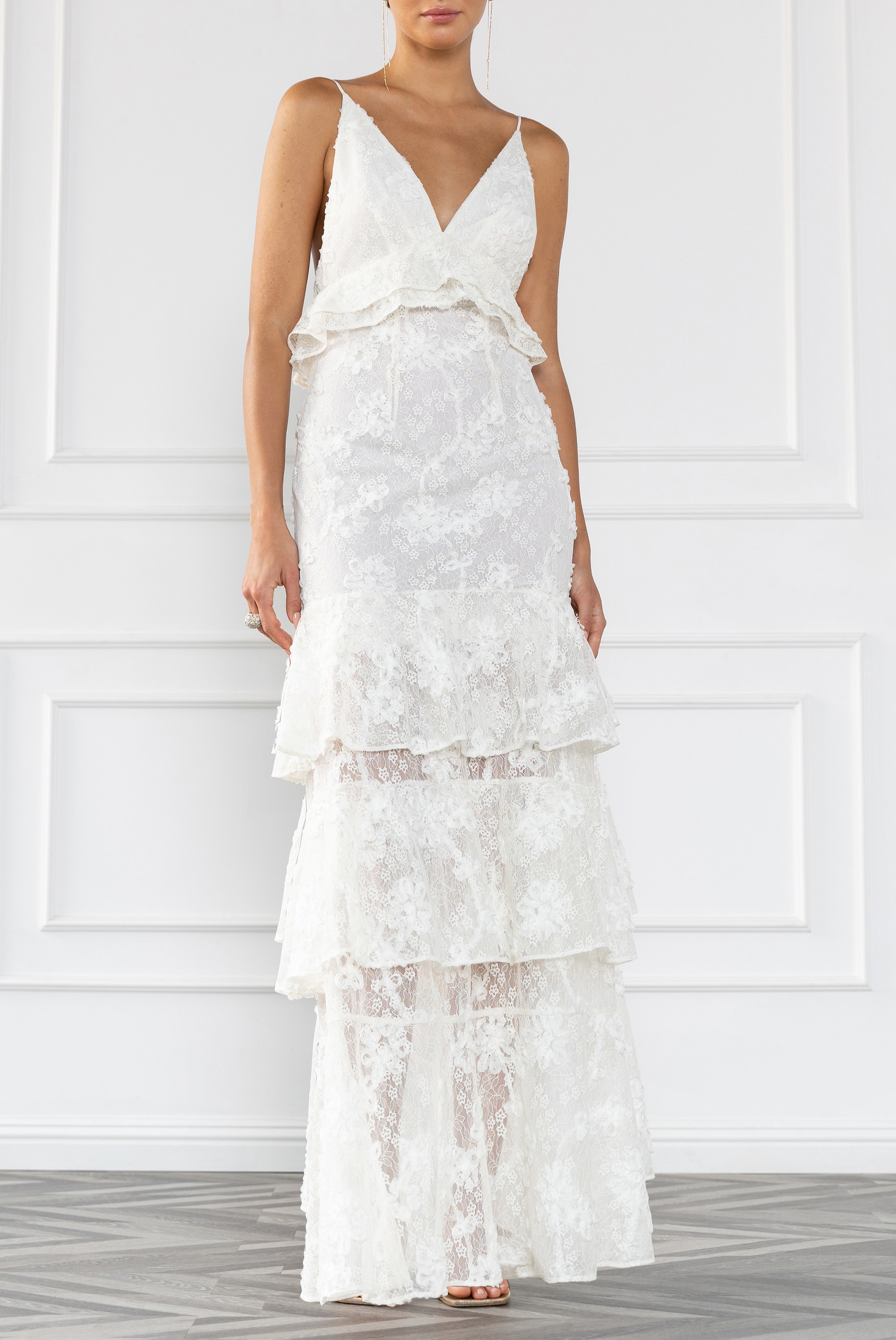 The Eris Maxi Dress is crafted in delicate lace with a plunging V-neckline and a softly layered silhouette. Adjustable spaghetti straps frame the shoulders while the open back adds an airy, refined feel. Tiered ruffles under the bust and throughout the skirt create dimension and movement, with sheer lace panels that extend through the lower skirt for a light, flowing finish.