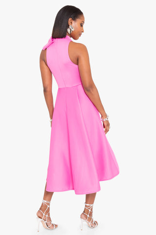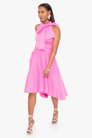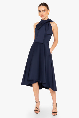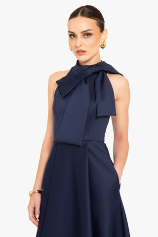 The Ara Cocktail Dress is designed to turn heads. This halter-style dress features a sleek neckline that’s elevated by an oversized attached bow, creating a bold focal point. The full high-low skirt brings volume and graceful movement, making it perfect for formal occasions, weddings, or any night that calls for a show-stopping look.