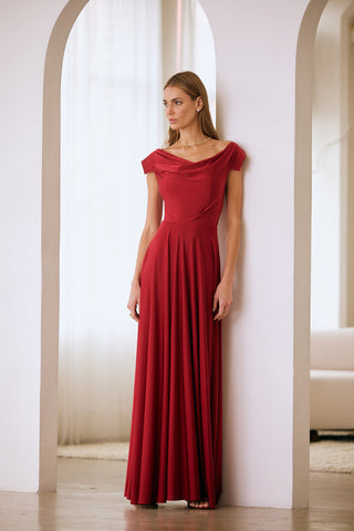 The Jacqueline Gown crafted from soft stretch jersey, this dress showcases a draped off-the-shoulder neckline that gracefully frames the collarbone. The tucked bodice detailing enhances the silhouette, leading into a flowing floor-length skirt. Designed for ease, it slips on without closures and is fully lined for added comfort.