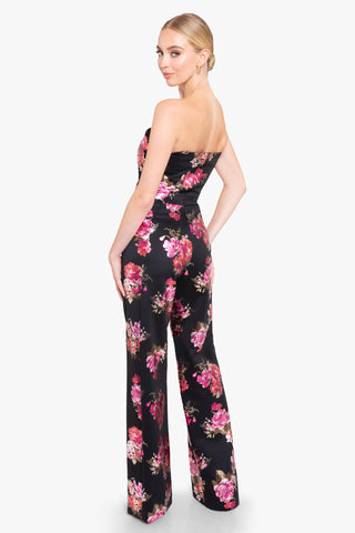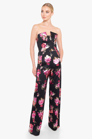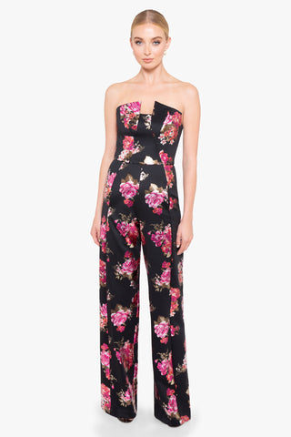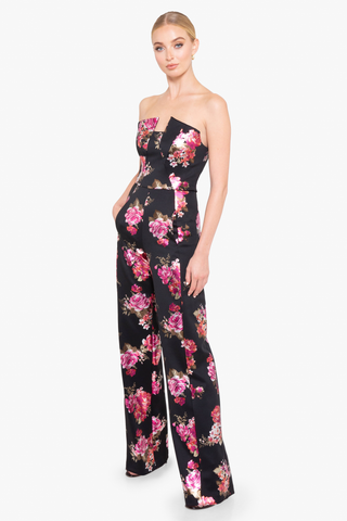 The Lena jumpsuit offers a modern twist on floral elegance. Featuring a strapless neckline and a bold floral print, it combines sophistication with a playful edge. A cut-out detail at the bodice adds contemporary flair, while the wide-leg silhouette and side seam pockets provide comfort and functionality.