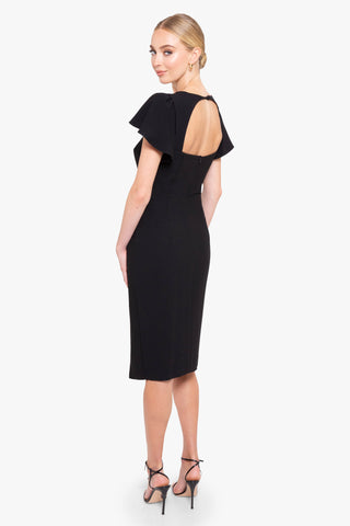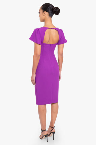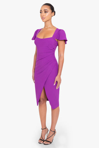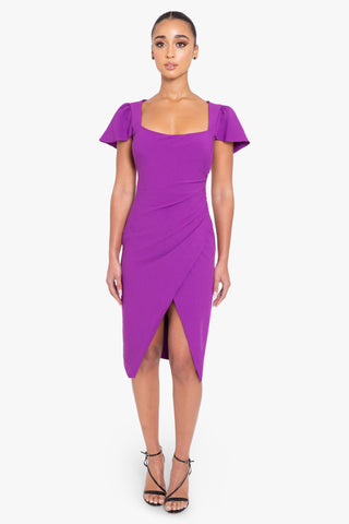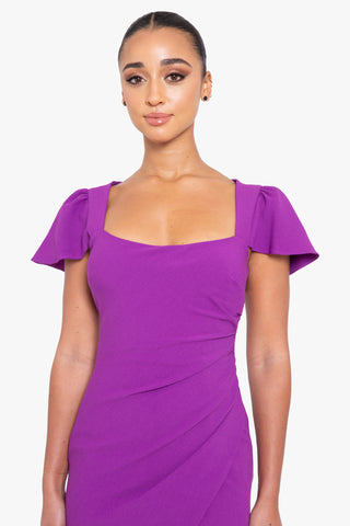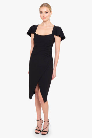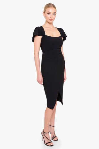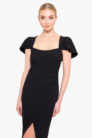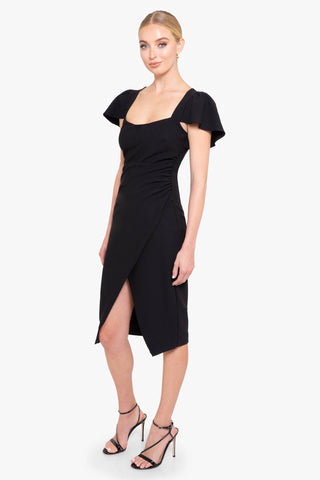 Adorned with delicate flutter sleeves and a chic front slit, the Meredith Dress captivates with its intricate details. The daring open back adds a touch of irresistible magnetism, while the flattering ruched detailing along the sides accentuates your curves beautifully.