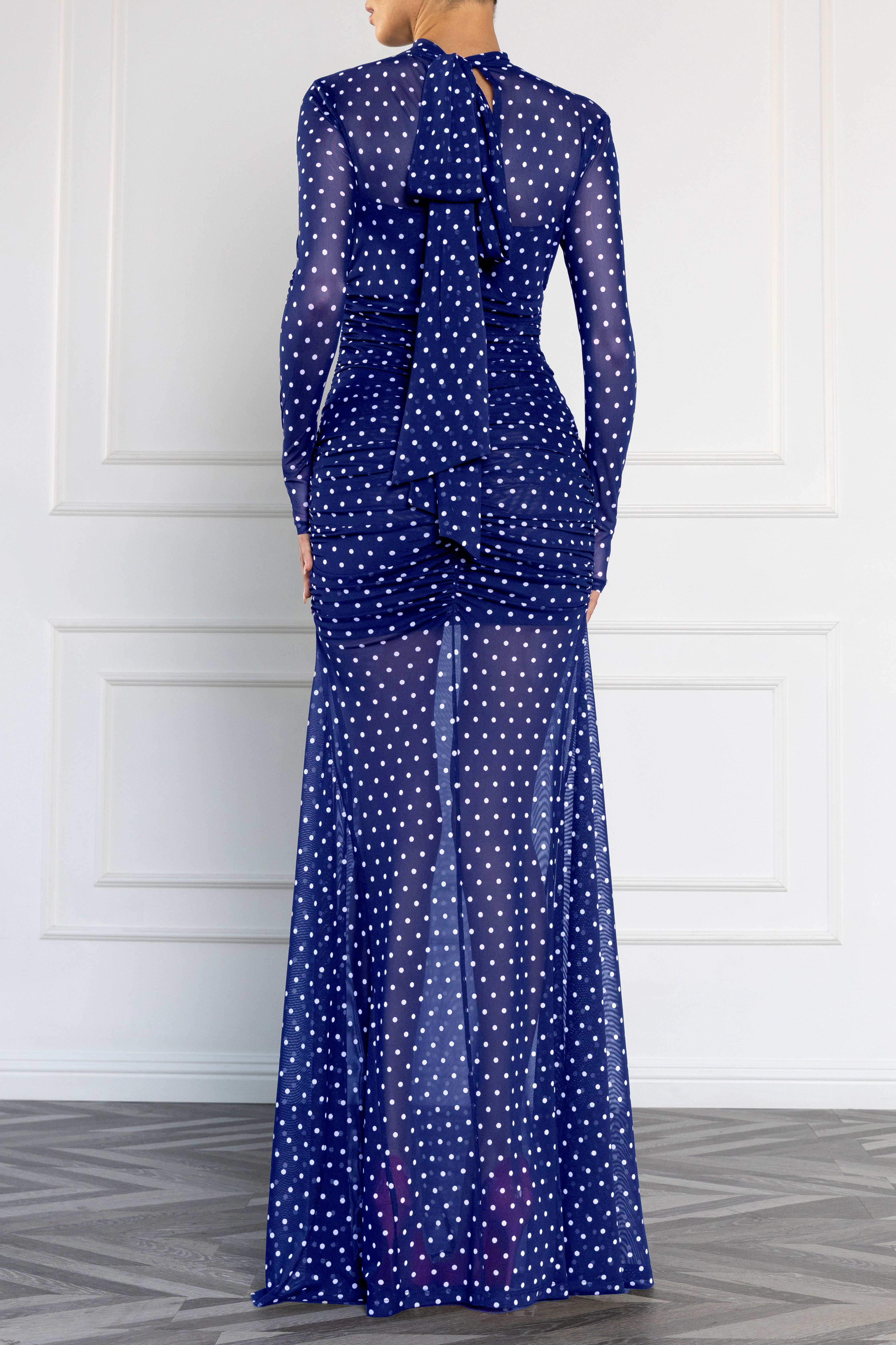 A sheer, statement-making gown designed for bold nights and memorable entrances. Crafted in polka-dot mesh, the Scarlett Gown features a sleek mock neckline, long sleeves, and a floor-length silhouette that floats with ease. Its body-hugging mini slip balances coverage and allure, while the dramatic long tie at the neck adds styling versatility—wear it draped down the back or knotted at the front for a personalized twist.